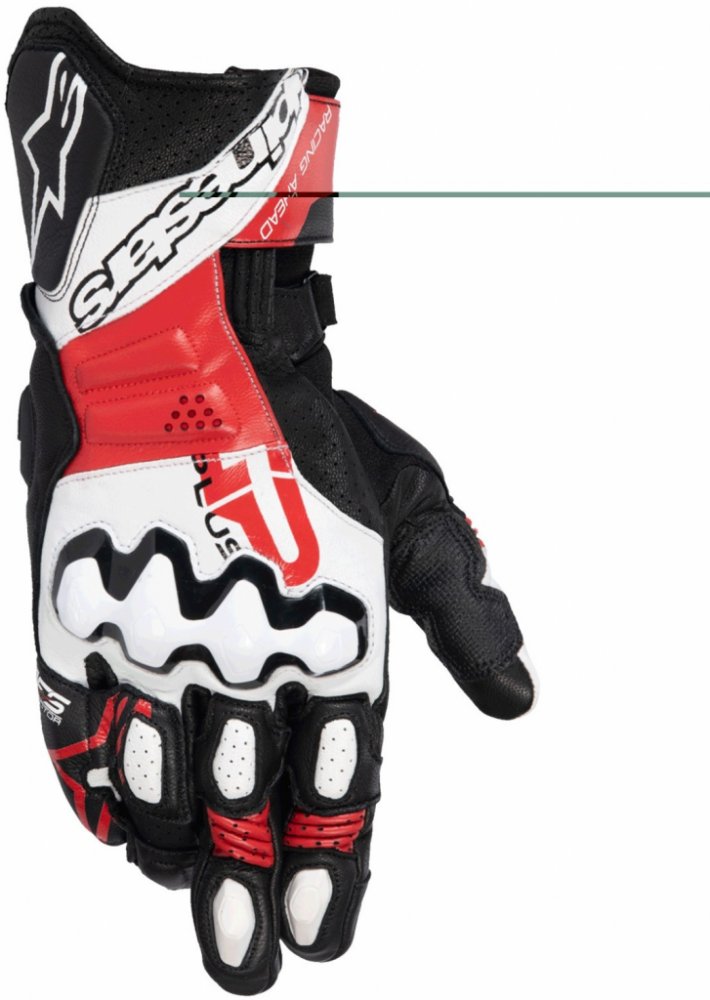 Konstrukce manžety poskytuje bezpečný a komfortní střih, zatímco výztuhy na dlani zajišťují trvanlivost a odolnost proti oděru. Předtvarovaný design rukavic a spojovací můstek mezi malíčkem a prsteníčkem. Tyto přednosti předurčují GP PLUS R V3 jako perfektní rukavice pro plné nasazení především během okruhového ježdění.