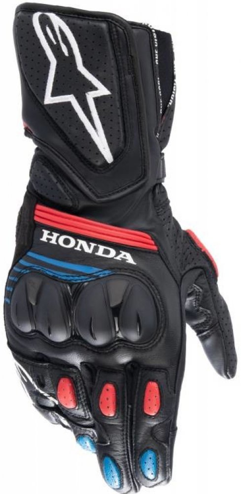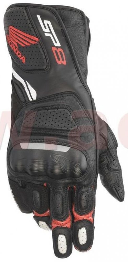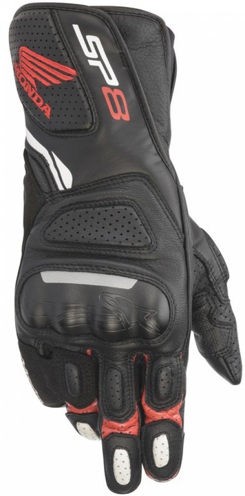 Rukavice SP-8 třetí generace jsou populární dlouhé sportovní rukavice nesoucí závodní DNA značky ALPINESTARS. Obšívka rukavice je vyrobena z kozí kůže v kombinaci se syntetickým mikrovláknem. Zahrnuje vícepanelové uspořádání s integrovanými protektory pro dosažení vysokého standardu ochrany proti oděru a komfortu současně. Chránič zápěstí tvoří protektor z TPU plastu. Zapínání pomocí zdvojené manžety na suchý zip a strečový můstech mezi palcem a ukazováčkem zajišťují zvýšený komfort. Verze rukavice v rámci kolekce HONDA.