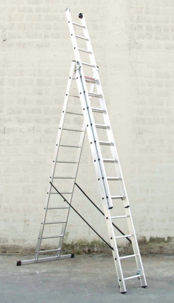 Hliníkový žebřík ALPOS EXPERT v provedení profi je možno použít jako výsuvný štaflový žebřík, štafle nebo opěrný žebřík. Provedení profi zaručuje spolehlivost tohoto žebříku při náročných pracích, řemesle nebo odborné profesi. Zesílené profily z tažených profilů na nejvíce namáhaných dílech Vám zajistí velmi stabilní postoj a budou zdrojem pocitu bezpečí při Vaší práci. Jedná se o velmi kvalitní provedení žebříku, který má ocelové bezpečnostní zámky, nadstandardně široké příčky s průřezem 35x30 mm (zajistí pohodlonou práci na žebříku) a profilované boční stěny. Žebřík je na třetím dílu vybaven kolečky pro snazší vysouvání dílu. Pro zvýšení bezpečnosti a komfortu při práci doporučujeme nákup příslušenství. Kód 38-07 3 x 7 2,15 m 4,80 m 4,00 / 5,80 m 3,34 m 1,98 / 3,98 m 14,6 kg 38-08 3 x 8 2,43 m 5,60 m 4,51 / 6,81 m 3,93 m 2,57 / 4,87 m 16,7 kg 38-09 3 x 9 2,71 m 6,10 m 5,01 / 7,31 m 4,37 m 3,01 / 5,31 m 18,0 kg 38-10 3 x 10 2,99 m 6,41 m 5,32 / 7,62 m 4,74 m 3,38 / 5,68 m 19,9 kg 38-11 3 x11 3,27 m 7,22 m 6,13 / 8,43 m 5,00 m 3,65 / 5,95 m 22,4 kg 38-12 3 x12 3,55 m 8,30 m 7,21 / 9,51 m 5,81 m 4,45 / 6,75 m 27,8 kg 38-13 3 x13 3,84 m 8,58 m 7,49 / 9,79 m 6,08 m 4,72 / 7,02 m 30,1 kg 38-15 3 x15 4,40 m 9,66 m 8,57 / 10,87 m 6,88 m 5,53 / 7,83 m 38,8 kg