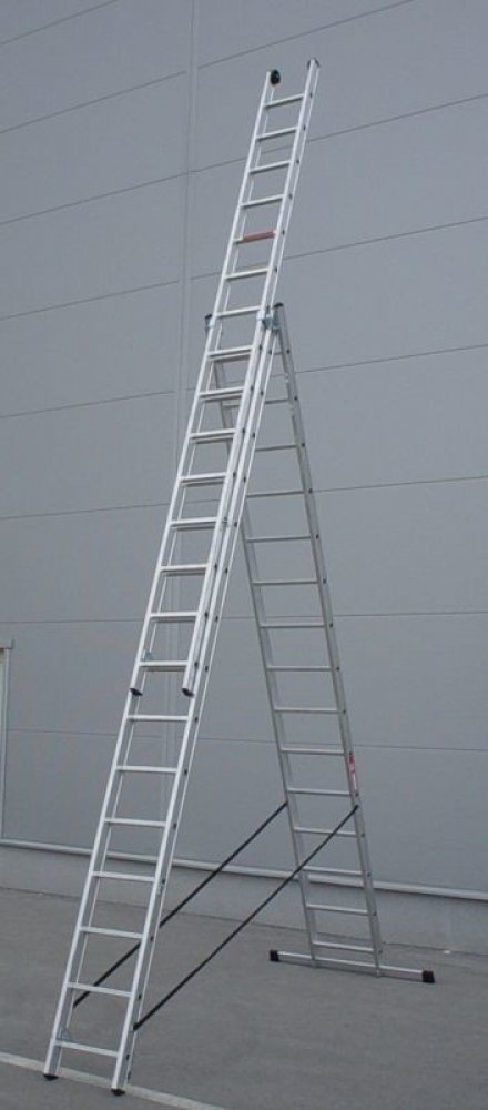 Hliníkový žebřík ALPOS EXPERT v provedení profi je možno použít jako výsuvný štaflový žebřík, štafle nebo opěrný žebřík. Provedení profi zaručuje spolehlivost tohoto žebříku při náročných pracích, řemesle nebo odborné profesi. Zesílené profily z tažených profilů na nejvíce namáhaných dílech Vám zajistí velmi stabilní postoj a budou zdrojem pocitu bezpečí při Vaší práci. Jedná se o velmi kvalitní provedení žebříku, který má ocelové bezpečnostní zámky, nadstandardně široké příčky s průřezem 35x30 mm (zajistí pohodlonou práci na žebříku) a profilované boční stěny. Žebřík je na třetím dílu vybaven kolečky pro snazší vysouvání dílu. Pro zvýšení bezpečnosti a komfortu při práci doporučujeme nákup příslušenství. Kód 38-07 3 x 7 2,15 m 4,80 m 4,00 / 5,80 m 3,34 m 1,98 / 3,98 m 14,6 kg 38-08 3 x 8 2,43 m 5,60 m 4,51 / 6,81 m 3,93 m 2,57 / 4,87 m 16,7 kg 38-09 3 x 9 2,71 m 6,10 m 5,01 / 7,31 m 4,37 m 3,01 / 5,31 m 18,0 kg 38-10 3 x 10 2,99 m 6,41 m 5,32 / 7,62 m 4,74 m 3,38 / 5,68 m 19,9 kg 38-11 3 x11 3,27 m 7,22 m 6,13 / 8,43 m 5,00 m 3,65 / 5,95 m 22,4 kg 38-12 3 x12 3,55 m 8,30 m 7,21 / 9,51 m 5,81 m 4,45 / 6,75 m 27,8 kg 38-13 3 x13 3,84 m 8,58 m 7,49 / 9,79 m 6,08 m 4,72 / 7,02 m 30,1 kg 38-15 3 x15 4,40 m 9,66 m 8,57 / 10,87 m 6,88 m 5,53 / 7,83 m 38,8 kg