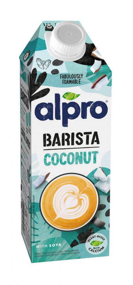 Alpro Barista Sójovo-kokosový nápoj 1000 ml. Umocní chuť kávy, dodá bohatší buket a sladkou chuť tropického kokosu. Skvělá chuť a bohatá, krémová textura, která funguje horká i ledová. Mléko je přirozeně bez laktózy a ze 100% rostlinných složek. Vyznačuje se nízkým obsahem tuku i cukru. Složení : Pitná voda, kokosové mléko 3,5 % (kokosový krém, pitná voda), loupané sójové boby 2,9 %, cukr, fruktóza, regulátory kyselosti (fosforečnany draselné), uhličitan vápenatý, mořská sůl, aroma, stabilizátor (guma gellan). Může obsahovat stopy skořápkových plodů.