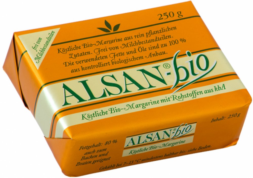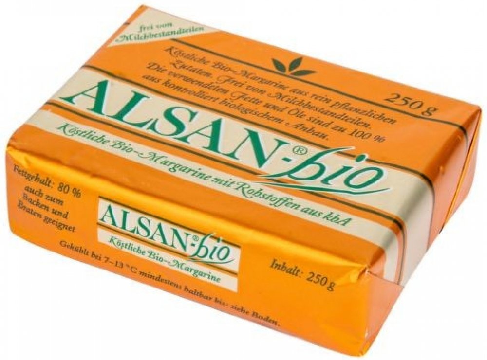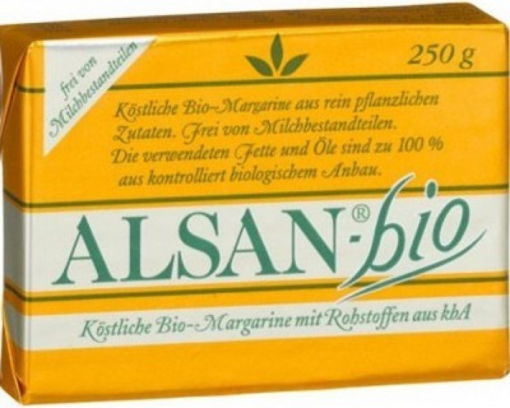 Alsan je výborný bio rostlinný margarín, který nejen svou konzistencí, ale hlavně chutí připomíná máslo. Je vyrobený z neztužených, neesterifikovaných tuků. Obsahuje chutný, za studena lisovaný kokosový olej a za studena lisovaný citronový olej. Alsan Bio je bez cholesterolu a bez mléčných složek, je tedy vhodný při alergii nebo intoleranci na laktózu. Alsan se hodí nejen k namazání na chléb, ale ...