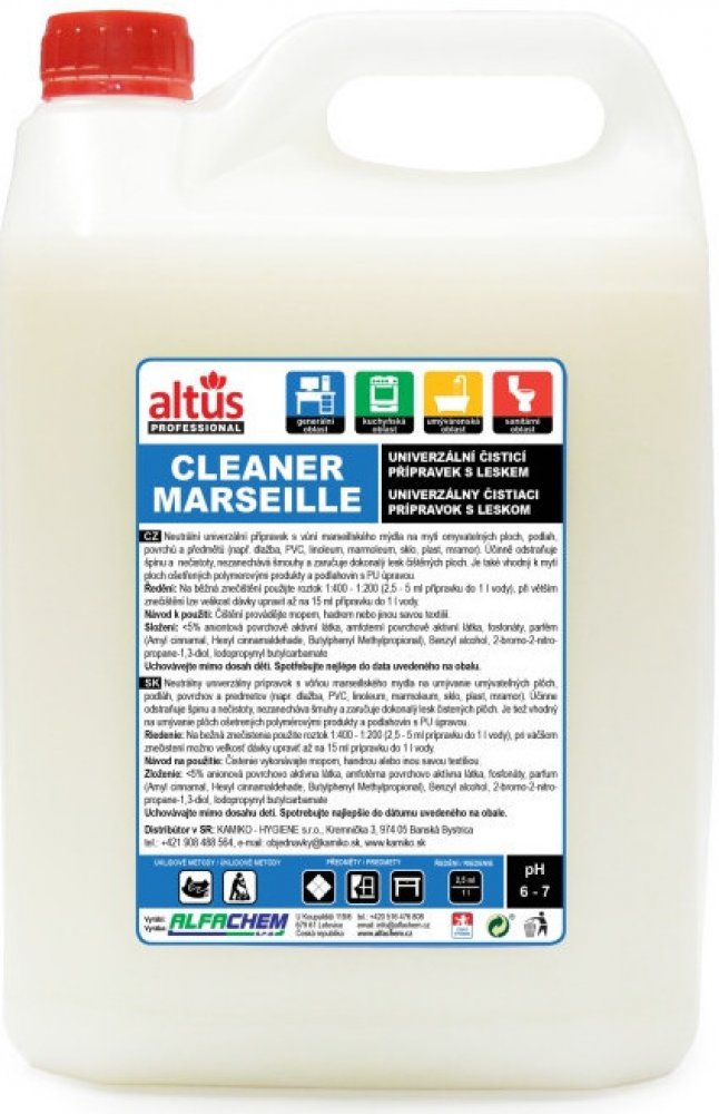 ALTUS Professional CLEANER MARSEILLE univerzální přípravek s vůní marseillského mýdla na mytí omyvatelných ploch, podlah, povrchů a předmětů (např. dlažba, PVC, linoleum, marmoleum, sklo, plast, mramor). Efektivně odstraňuje špínu a nečistoty, nezanechává šmouhy a zaručuje dokonalý lesk čištěných ploch. Vhodný také k mytí ploch ošetřených polymerovými produkty a podlahovin s PU úpravou.