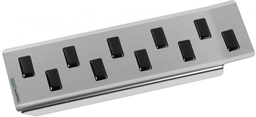 Opěrka je vyrobena z kvalitní nerezové oceli (žádný laciný hliník ale poctivý kov), na její vnější straně jsou nalisovány příčné protiskluzové výstupky z gumo-plastu.