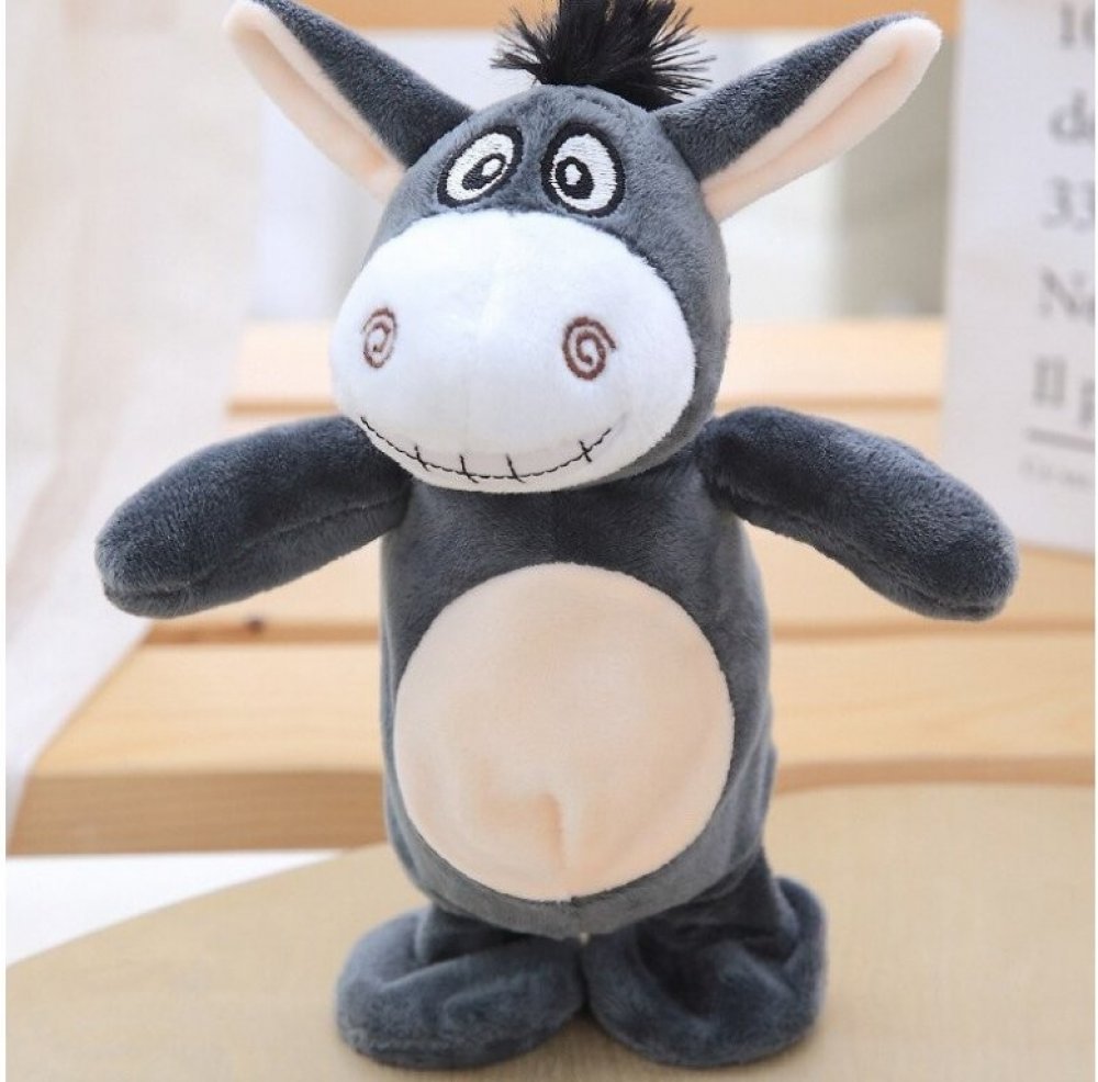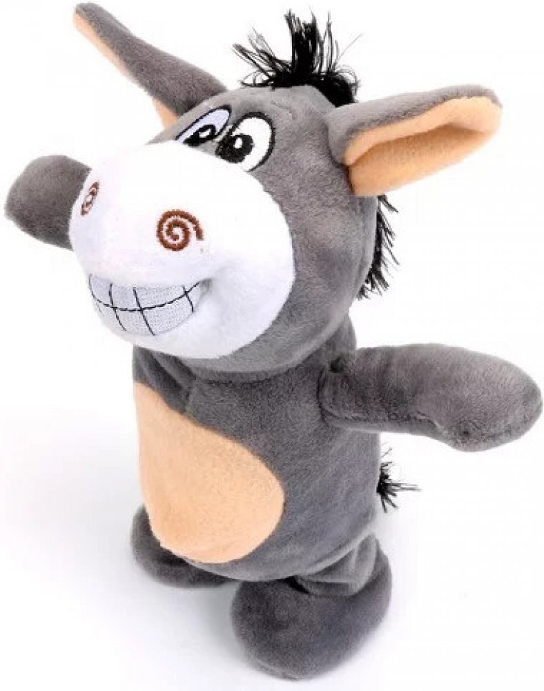 Rozkošný oslík, který chodí a dokonce mluví! Nový ukecaný kamarád pro vaše děti! Stačí k němu promluvit a on vaši větu zopakuje přesně tak, jak jste ji řekli. Příjemný plyšový materiál a interaktivita tohoto mazlíčka zaujme a zabaví každé dítko. Je vysoký 23 cm a funguje na 3 AAA baterie, které nejsou součástí balení.