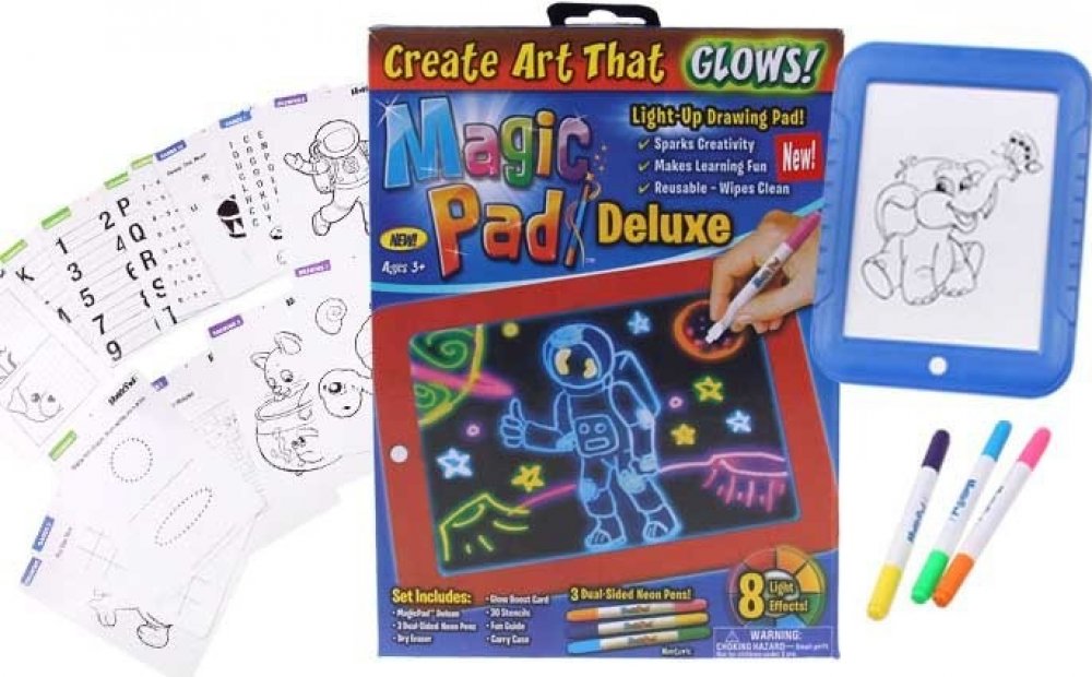 Tato dětská tabule záři pomocí LED světel. Děti s ní mohou popustit uzdu fantazii a nakreslit si vše, co je napadne – od svítících vesmírných příšer až po oslnivý podmořský svět. Jedním tahem obrazovku setřou a mohou kreslit něco jiného.
