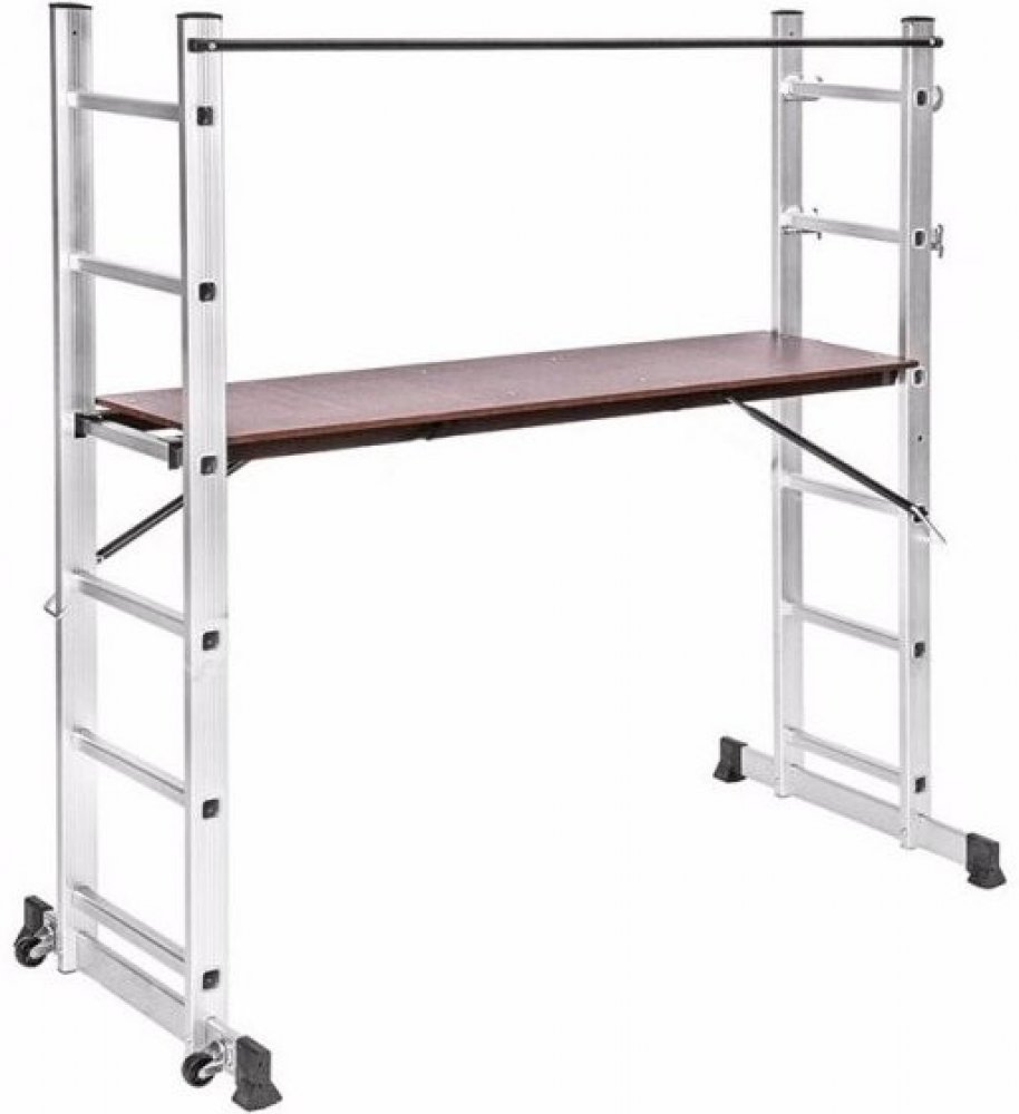 Spodní hrany jsou opatřené ochrannými krytkami. Lešení je vhodné pro vnitřní i venkovní použití. Základem konstrukce jsou dva hliníkové žebříky a pracovní plošina s protiskluzovým povrchem. Plošina je vyrobena z voděodolné silné překližky.