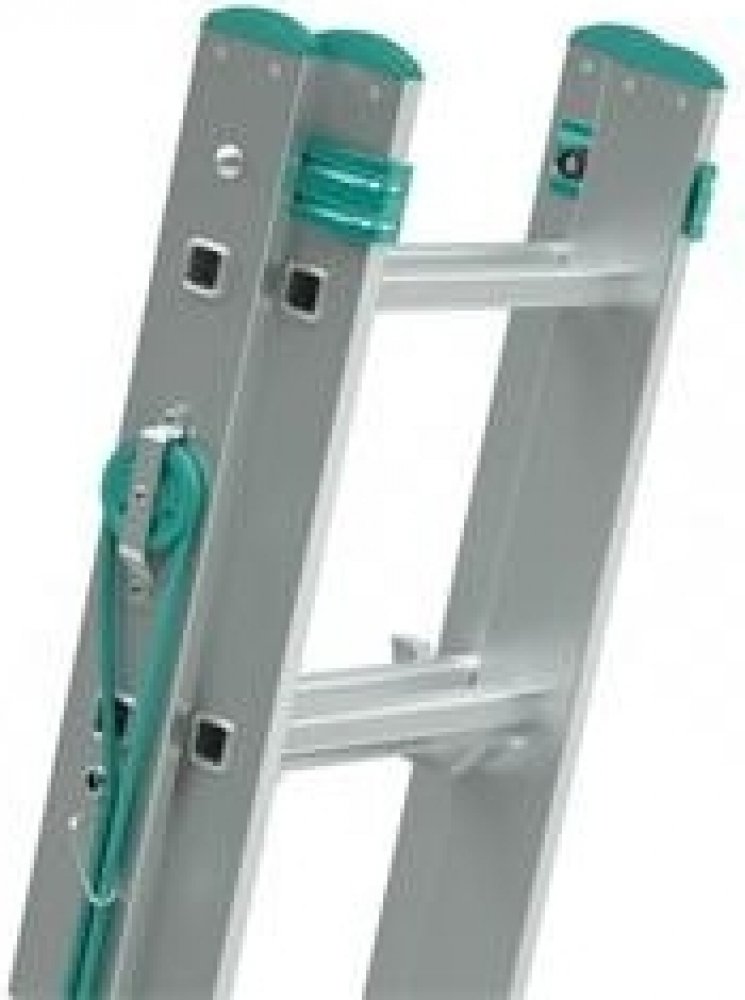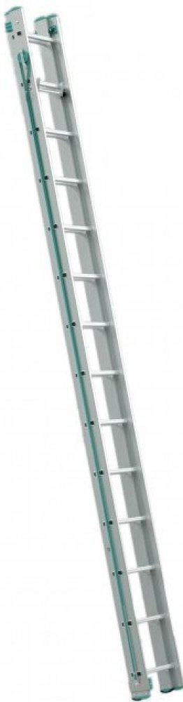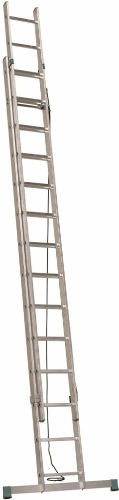Dvoudílný výsuvný žebřík s lanem Eurostyl, počet příček 2x14 nebo 2x16, max. výsuvná délka 6,81 až 7,66 m a šířka 397 mm.