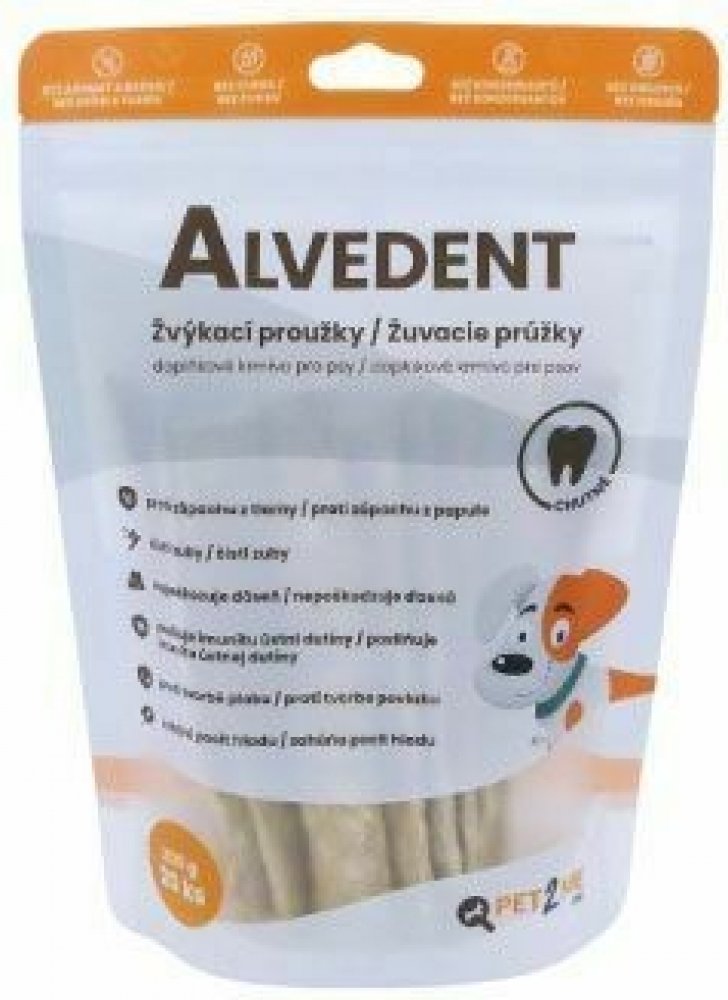 Pravidelné užívání žvýkacích proužků Alvedent pomáhá odstraňovat zápach z tlamy a brání tvorbě plaku. Laktoperoxidáza obsažena ve žvýkacích proužcích posiluje přirozenou imunitu a obranyschopnost ústní dutiny. Žvýkáním proužků si psi mechanicky čistí své zuby a odstraňují zbytky krmiva. Současně se tak uvolňují enzymy, které zabraňují tvorbě plaku. Složení: Maso a vedlejší produkty živočišného původu (drcená hovězí kůže), syrovátka a hydrolyzované bílkoviny (zdroj laktoperoxidázy). Dávkování: 1-2 ks žvýkacích proužků jako pamlsek po každém krmení. Skladování: Skladujte na suchém a chladném místě při teplotě do 20 °C.