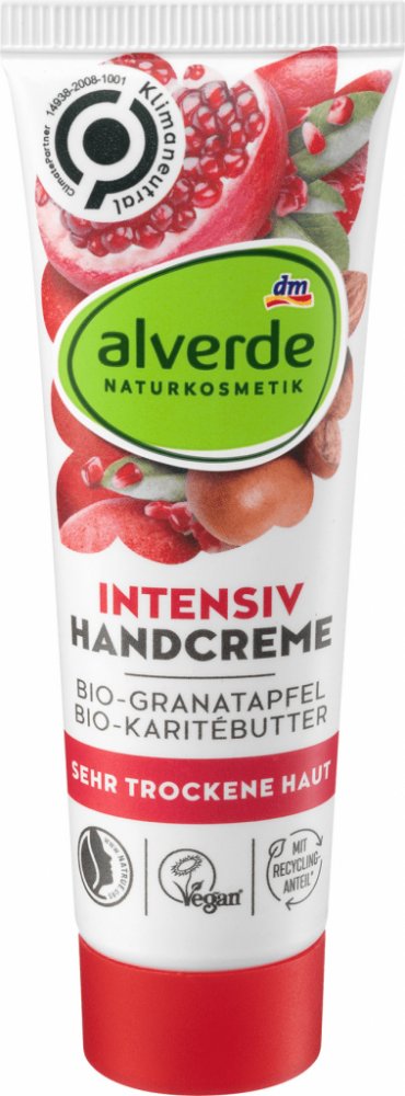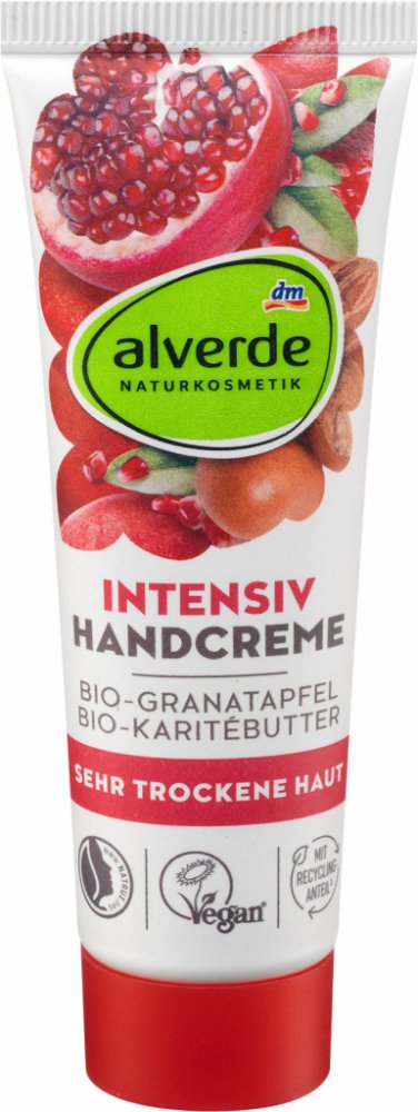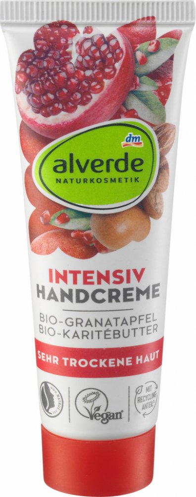 alverde krém na ruce Intensiv s obsahem složení s cenným olejem z granátového jablka a karité másla původem z kontrolovaného biologického zemědělství podporuje regeneraci suché, namáhané a popraskané pokožky, které dodá okamžitou a dlouhotrvající hydrataci. Pokožka rukou bude zklidněna a dlouhodobě chráněna před vysušením. Pro dokonale hebké ruce!