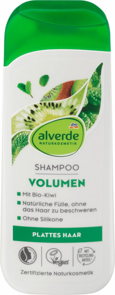 alverde NATURKOSMETIK šampon na vlasy Volumen je ideální pro jemné vlasy bez objemu. Jemná receptura s výtažkem z kiwi a jablečné máty myje vlasy šetrně a pomáhá posilovat vlasovou strukturu bez zatížení. Dopřejte vašim vlasům tu nejlepší péči od značky alverde NATURKOSMETIK.##*Obal obsahuje nejméně 70 % recyklovaného materiálu.#Neobsahuje syntetické vonné, barvící ani konzervační látky. Neobsahuje látky na bázi minerálních olejů. Bez geneticky modifikovaných složek. 99 % složek** je klasifikováno jako biologicky rozložitelných***.#**Na základě součtu jednotlivých organických složek.#***Podle metod OECD 301, 302 nebo ekvivalentních metod.