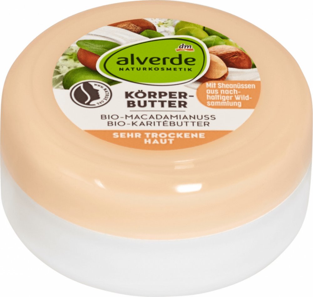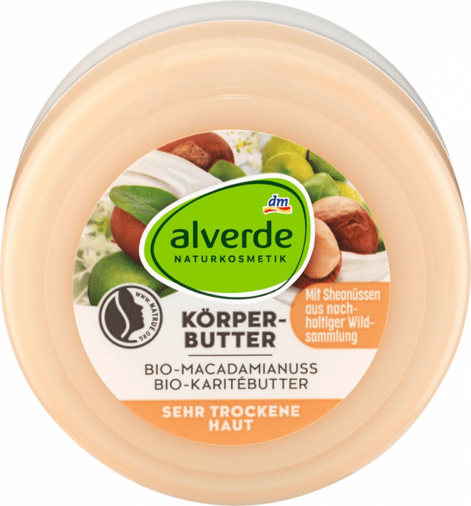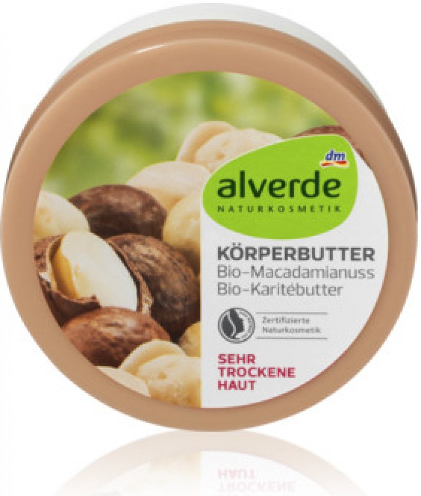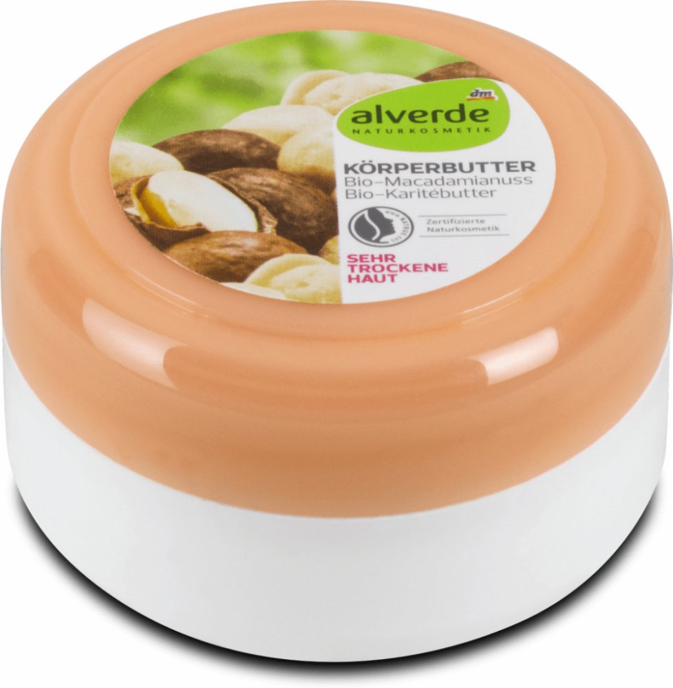 alverde tělové máslo s bio makadamovým oříškem a bio bambuckým máslem chrání, hydratuje a intenzivně pečuje o velmi suchou pokožku. Kombinace účinných látek s organickým bambuckým máslem a organickým olejem z makadamového ořechu dodá pokožce intenzivní dlouhotrvající ochranu a péči. Tato péče je vhodná zejména pro velmi suchou pokožku.