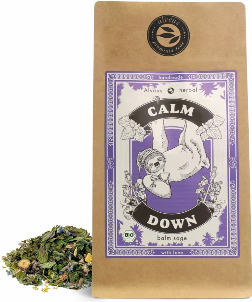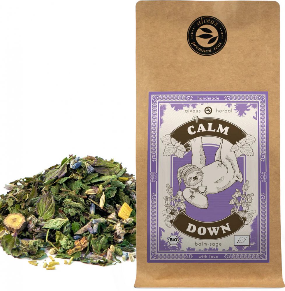 Čaj Alveus Calm Down ORGANICMeduňka s příchutí šalvěje, 100 g Čaj Alveus Calm Down ORGANIC si můžete vychutnat kdykoli v průběhu dne. Je bez kofeinu, díky čemuž je vhodný i pro děti. Je navíc v BIO kvalitě, jeho součástí jsou suroviny pocházející z ekologického zemědělství. Obsahuje meduňku, fenykl, kořen lékořice, rozmarýn, šalvěj, levanduli, květy chmele a kozlík. Meduňka působí jako antioxidant a přispívá k normální funkci dýchací soustavy, normálnímu trávení, činnosti srdce, emočnímu komfortu, zdravému spánku, duševní pohodě, relaxaci, kognitivnímu a mentálnímu zdraví, normální činnosti štítné žlázy, oběhové soustavy a kardiovaskulárního systému, zatímco levandule k normální funkci močových cest a ledvin, normálnímu trávení a činnosti jater, relaxaci, normální činnosti kardiovaskulárního systému a srdce a ke zdravému spánku. Fenykl napomáhá k normální funkci dýchacího systému a močových cest, normálnímu trávení, činnosti jater, pročištění těla, normální činnosti střev...