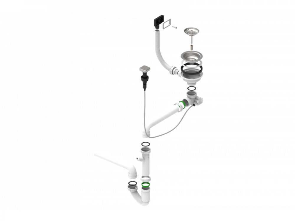 - Kompletní sítkový ventil pro úsporu místa včetně přepadu a odbočky na myčku