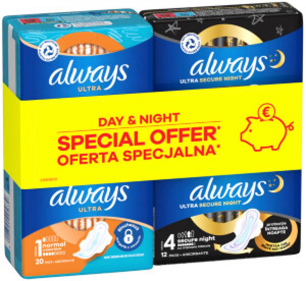 Always hygienické potřeby poskytují bezpečnou a diskrétní ochranu v průběhu celého menstruačního cyklu. Ultra absorpční jádro obsahuje speciální materiál, který rychle absorbuje a uzamkne tekutinu uvnitř vložky v množství několikanásobně vyšším než sám váží. Always jsou jediné vložky s Flexi křidélky. Tato flexibilní křidélka pomáhají chránit postranní části prádla. Díky nim vložka také lépe drží, i když je tělo v pohybu. Oba dva druhy Always vložek, ultra tenké i silné, poskytují spolehlivou ochranu. Níže uvedená tabulka poskytuje přehled různých balení vložek Always. Schopnost absorpce je označena malými kapkami na obale Always. Čím více kapek zde je, tím vyšší je absorpční schopnost vložky (tím lépe si poradí se silnějším výtokem). Always Ultra Super Plus poskytuje ochranu při silnějším výtoku v prvních dnech. Always Ultra Normal a Always Ultra Plus jsou ideální vložky pro středně silnou menstruaci nebo pro její poslední dny. Always Ultra Night jsou uzpůsobeny speciálně pro použití na noc tak, aby poskytly ochranu po delší dobu. Tři velikosti vložek: Normal = normální délka Super = delší vložka Night = delší a širší vložka