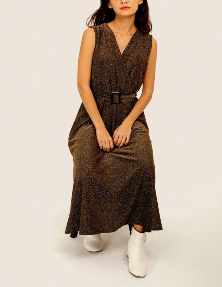 Krásné, celotřpytivé šaty vhodné pro slavnostní příležitosti, ples, oslavu apod.Elastický materiál v kombinaci černého podkladu a protkávaného zlatou nitkou.Materiál z vnitřní strany příjemný na dotek, neškrábe.Horní část šatů je řešená překřížením pro krásný dekolt.V pase přestřiženo a do gumy.Se samostatným páskem.Sukně volná, áčkového střihu.Bez rukávu. Kvalitní, elastický materiál.
