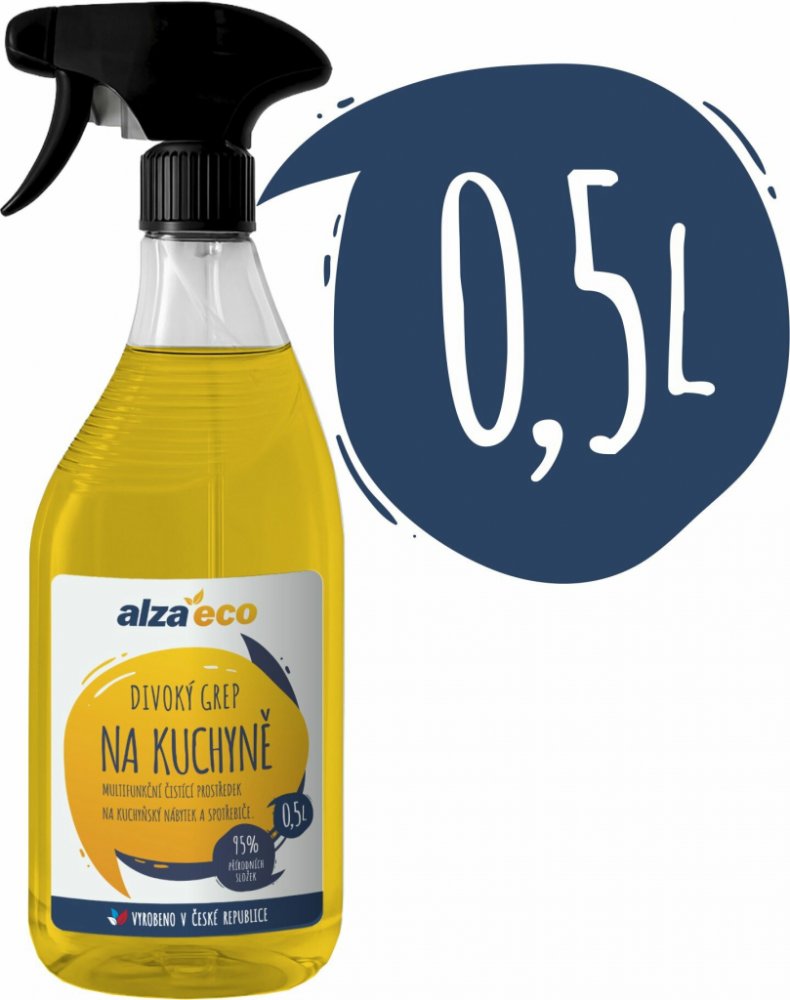 Pro dokonale čistou kuchyňTento čisticí prostředek je ideálním pomocníkem pro každodenní úklid kuchyně. Účinně odstraňuje mastnotu, zbytky jídla i zaschlé nečistoty z pracovních ploch, dřezů, sporáků, stolů či digestoří. Jeho receptura je založená na rostlinných ingrediencích a minerálech, obsahuje 95 % složek přírodního původu a všechny látky jsou biologicky rozložitelné, takže nezatěžují domácí septiky ani čističky odpadních vod. Neobsahuje parabeny, umělá barviva, formaldehyd, sulfáty ani mikroplasty. Použití je velmi snadné a čistič kuchyní AlzaEco ve formě pěny stačí nastříkat přímo na povrch, nechat krátce působit podle množství usazené nečistoty a poté setřít. Lahev je vyrobena ze 100% rPET materiálu – recyklovaného PET plastu, který byl znovu zpracován například z použitých lahví. Tento materiál má výrazně nižší ekologickou stopu než nový plast, šetří energii i suroviny a pomáhá snižovat množství odpadu. Český výrobekVýroba v Česku s sebou přináší udržitelnost, podporu i kvalitu.100% rPETLahev...