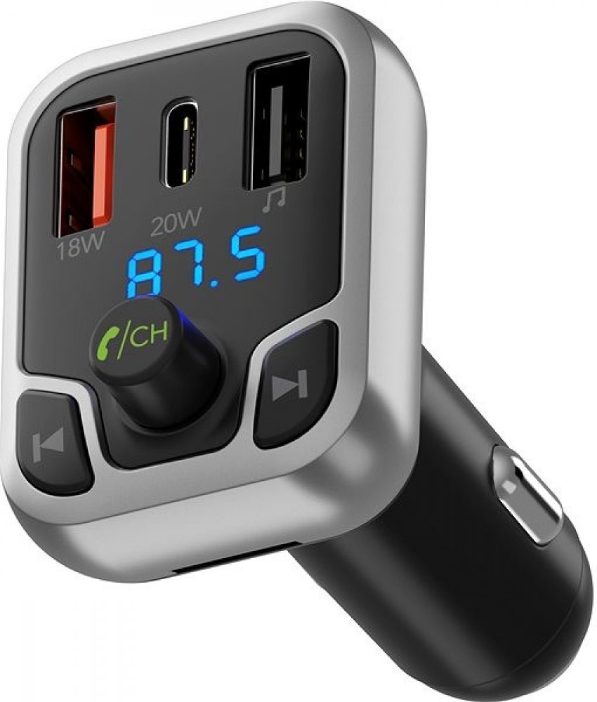 FM Transmitter - výstupy USB-C a USB-A, Bluetooth 5.0, čtečka Micro SD karet, mikrofon, displej, měřič napětí, handsfree, hudební přehrávač, ovládací tlačítko pro výběr frekvence / hlasitost zvuku, USB-C 18 W, nabíjení s podporou PD a QC3.0, max. velikost paměťové karty a max. kapacita USB flash disku 32 GB, vstupní napětí 12 a 24 V