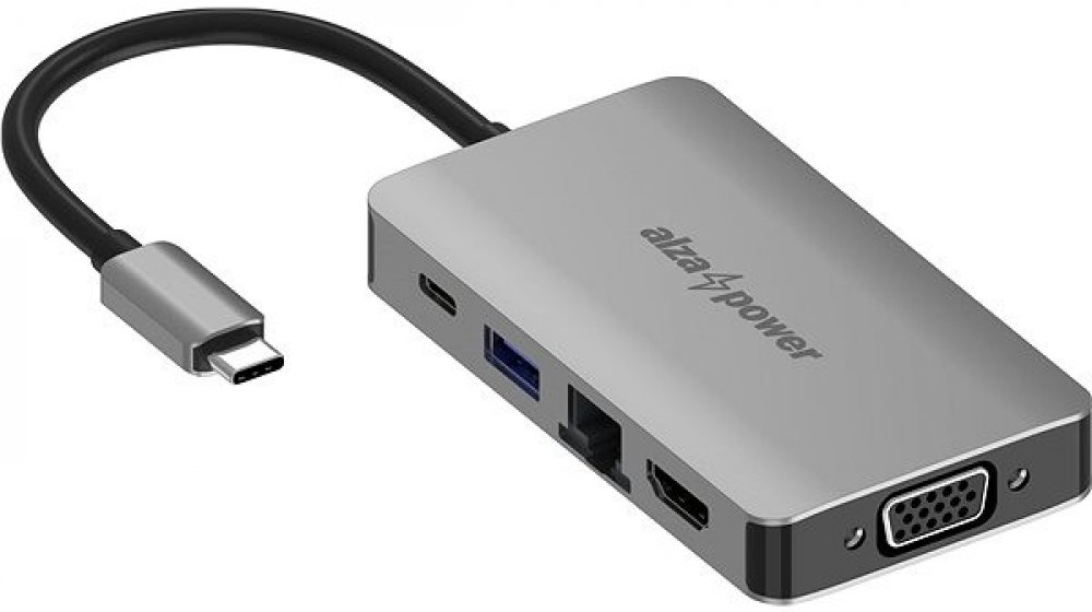 SuperSpeed USB 5 Gb/s, Power Delivery 3.0 100 W, připojení pomocí 1× USB-C (M) 3.2 Gen1, další konektory 1× USB-C (F) 3.2 Gen1, 2× USB-A (F) 3.2 Gen1, 1× HDMI 2.0 (4K/60Hz), 1× RJ-45, 1× D-Sub DE-15 (VGA), materiál opletu PVC, materiál těla hliník/plast, délka kabelu 15 cm (APW-HCA6Y)