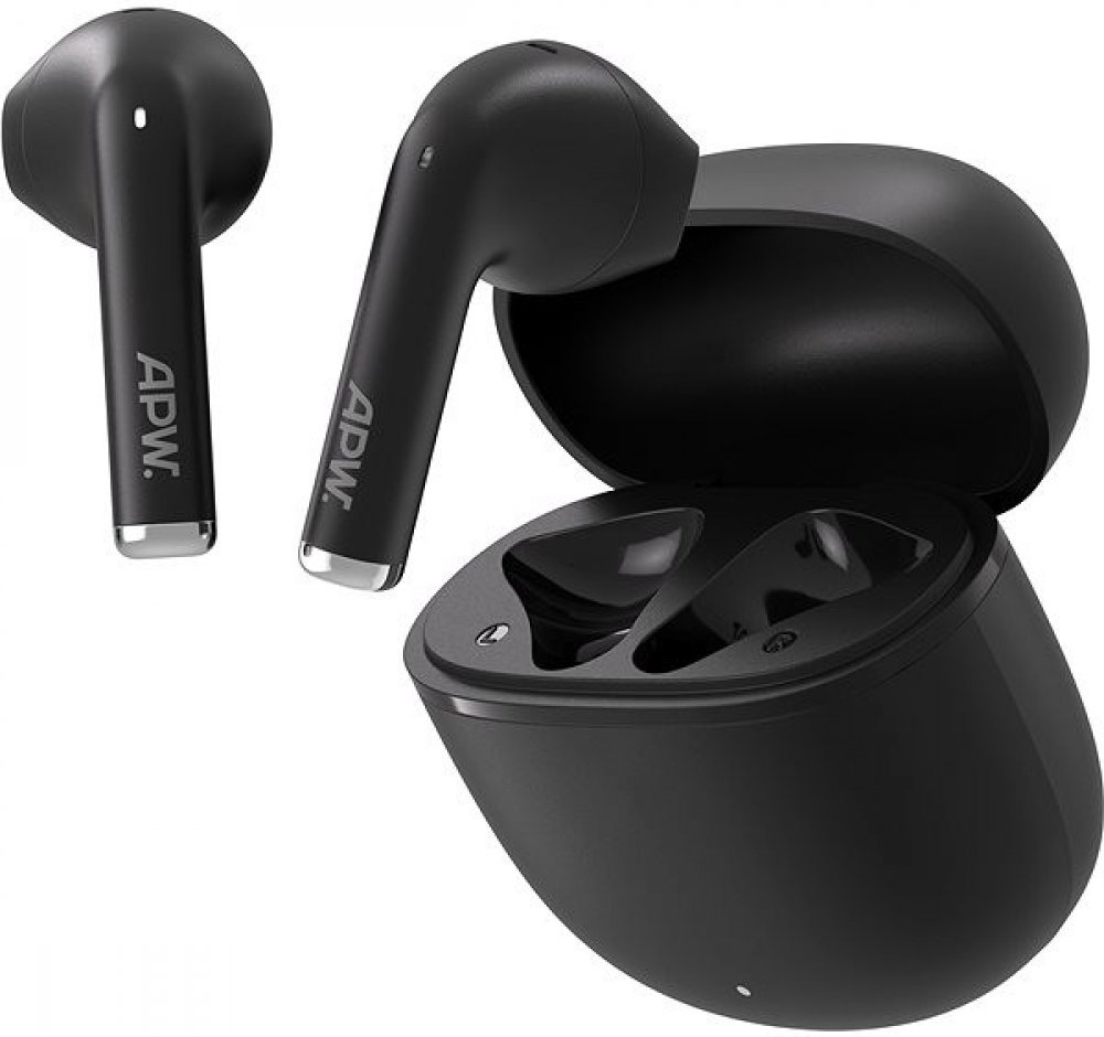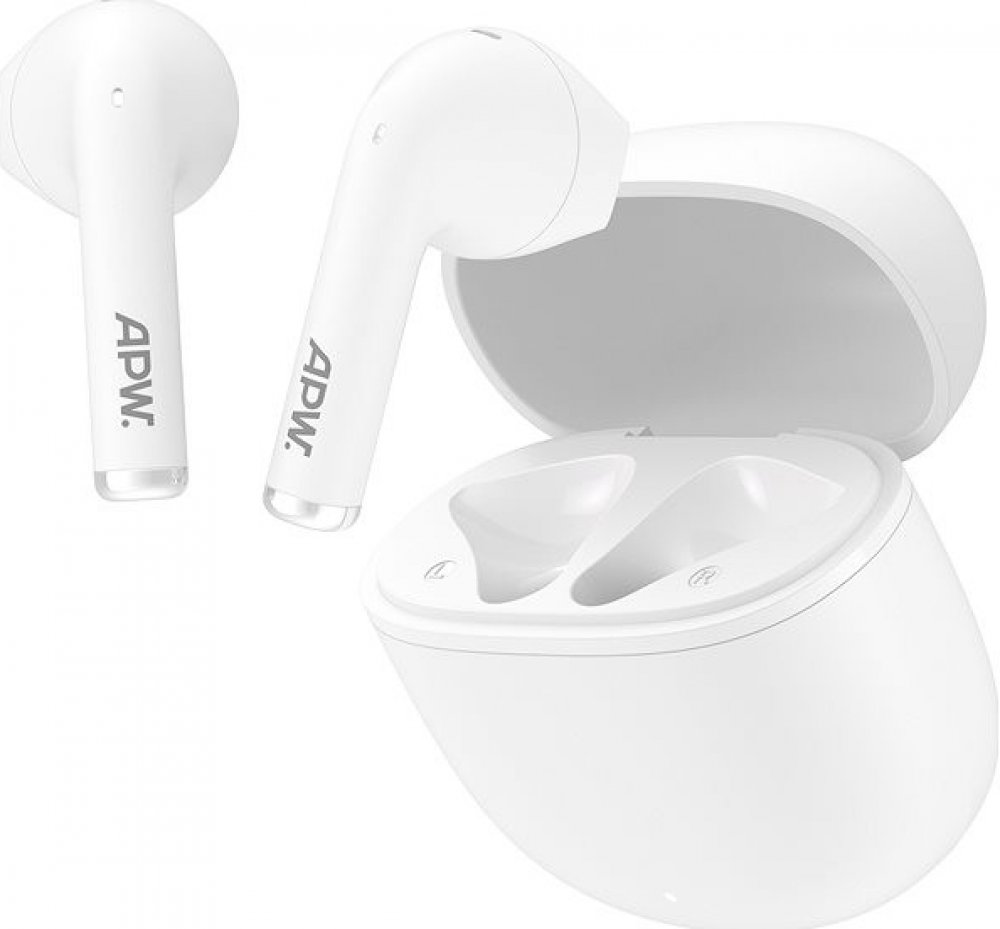 semi in-ear pecky, s integrovanými mikrofony, True Wireless, potlačení šumu ENC, uzavřená konstrukce, Bluetooth 5.3, podpora AAC, SBC, HFP, A2DP a AVRCP, hlasový asistent, přepínání skladeb, přijímání hovorů, režim nízké latence, frekvenční rozsah 20 - 20 000 Hz, max. výdrž baterie 28 h, v režimu Stand-by 60 h, doba nabíjení sluchátka a pouzdra 2 h, stupeň krytí IPX4 (APW-BTEC1W)