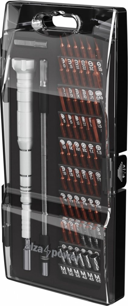 61 dílů v balení, teleskopický šroubovák, protáčecí madlo, flexibilní nástavec, přechodové nástavce C6.3/C4 a C4/C6.3, 6 oříšků, 45 magnetických bitů z oceli S2, 6 bitů z chromvanadiové oceli, 15cm flexibilní nástavec, pro opravu drobné elektroniky a mobilních telefonů (i pro Apple iPhone 7 a novější) (APW-TK610B)