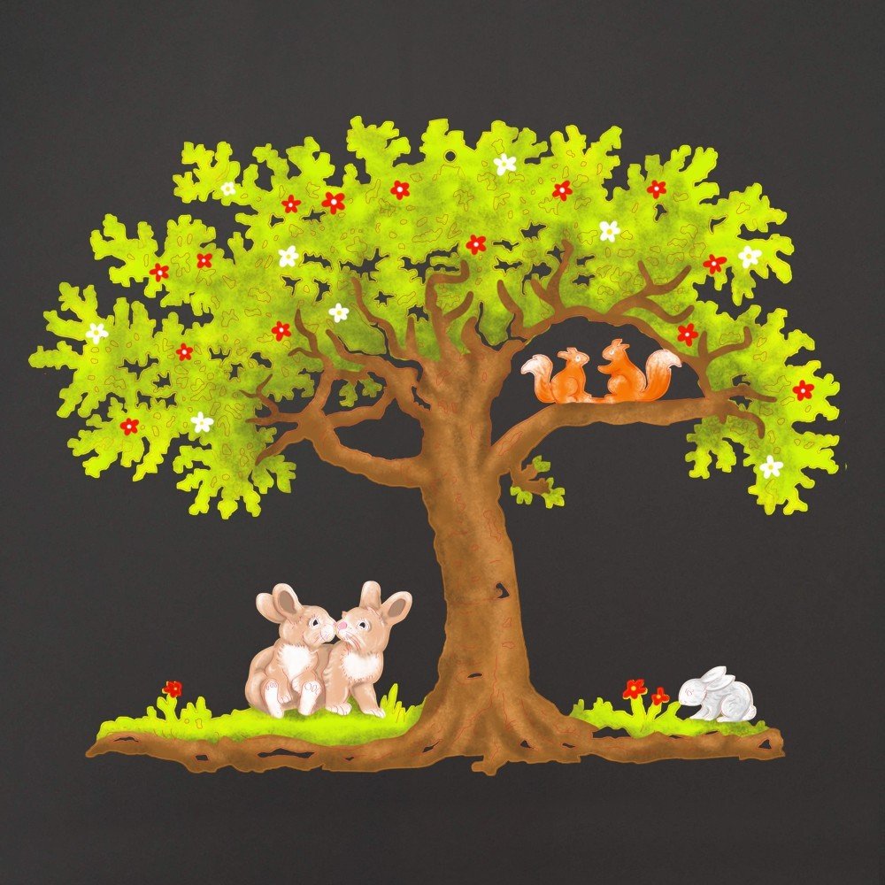 Dřevěná dekorace strom se zajíci je vyrobená z překližky topolu a vymalovaná. Tato dřevěná dekorace je určena k zavěšení, zabalená je na přířezu v sáčku. Barevně potištěno z jedné strany. Rozměr 18 x 15 cm. Český výrobek
