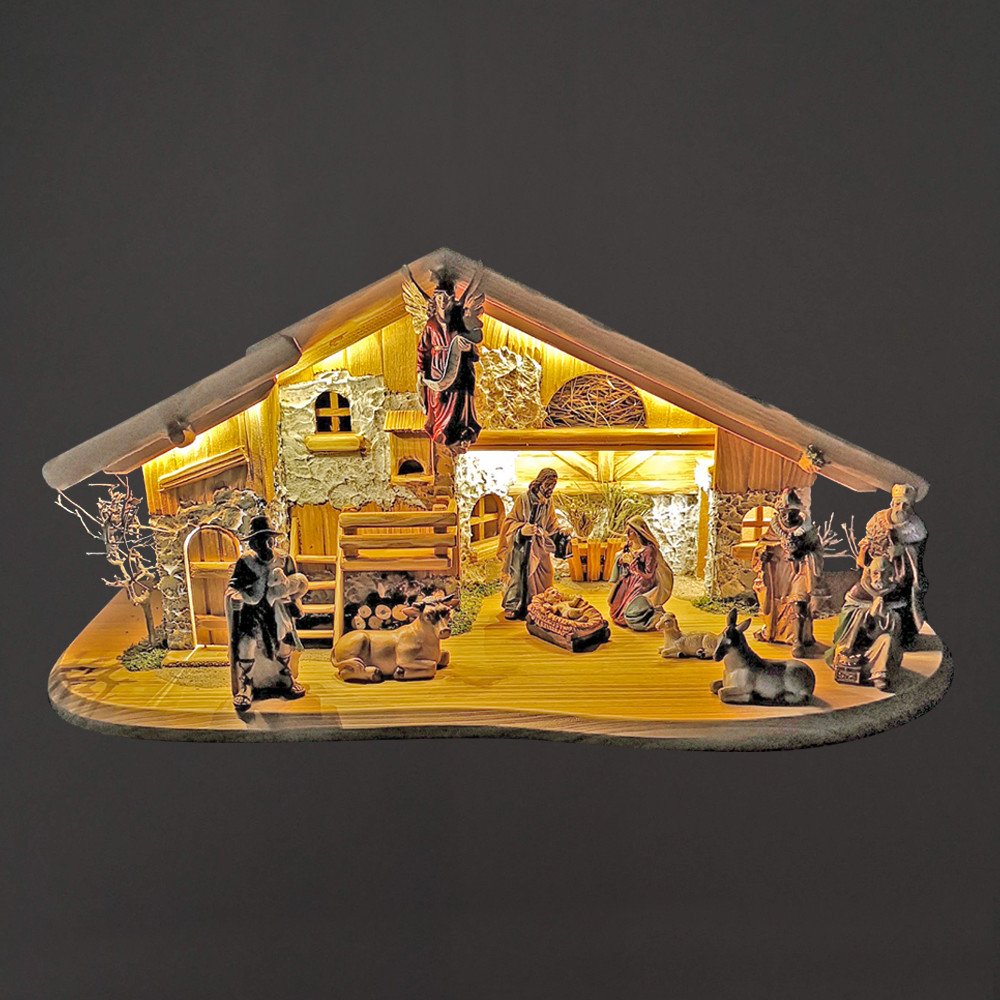 Tradiční ručně vyrobený betlém z masivního smrkového dřeva, ke kterému si každé Vánoce naaranžujete postavičky, což je i oblíbená činnost dětí. Součástí betlému jsou ručně malované figurky z umělého kamene o velikosti 11 cm - kód 34218. Betlém nebo také jesličky jsou uměleckým vyobrazením znázorňujícím Svatou rodinu. Rozměr betlému je délka 64,5 x šířka 30 x výška 30 cm, betlém je vyrobený z masivního smrkového dřeva, je na podstavci a má ručně dodělávané detaily, z výhradně přírodního materiálu, jako je mech, seno, břidlice. Na stěnách je použitá omítka a keře jsou z větviček. Součástí Vánoc jsou i tradice a tento betlém s postavičkami je dokonalou tradiční dekorací. Betlém je osvětlen pomocí světelného led řetězu zakončeného konektorem USB-A, adaptér do sítě není součástí. Lze použít běžný typ nabíječky na mobilní telefon, případně powerbanku. Český výrobek