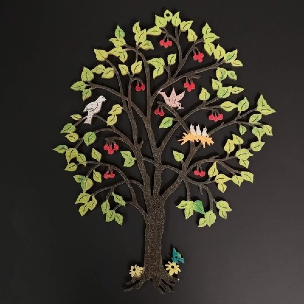 Dřevěný barevný strom s třešněmi a ptáčky je vyrobený z překližky topolu a vymalovaný. Tato dřevěná dekorace je určena k zavěšení, má rozněr 21 cm.
