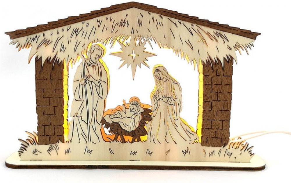 Dřevěná dekorace svítící portál s motivem betlému je vyrobená z topolové překližky a hnědé části jsou z mahagonové dýhy. Dekorace je s led podsvícením s připojením do zásuvky na 230 V. Rozměr portálu je 25 × 16 × 4,50 cm a zabalen je do dárkové krabice s průhledným víkem. ČESKÝ VÝROBEK