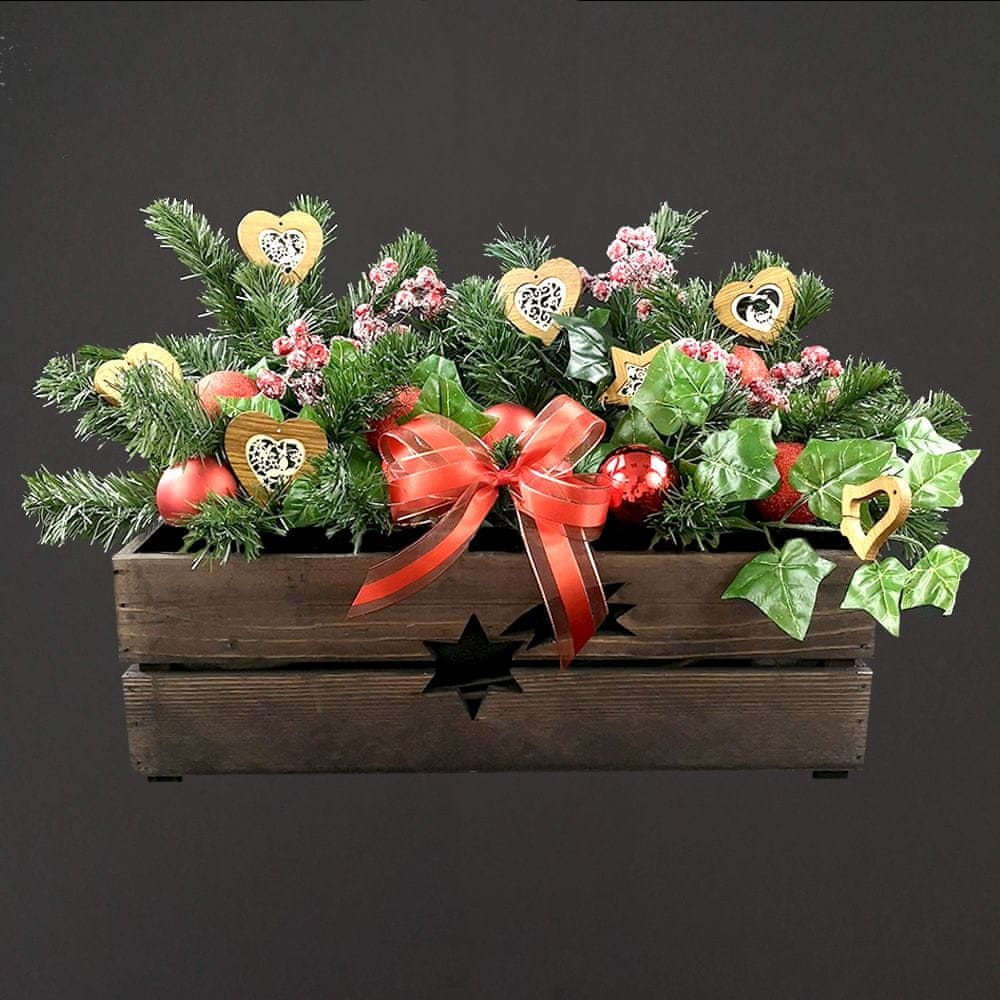 Dřevěný truhlík je vyrobený z masivního smrkového dřeva a namořený na hnědou barvu. Ve středu truhlíku je vyříznutý vánoční motiv komety. Truhlík je ozdobou nejen do interiéru, ale využití nalezne i v zastřešeném exteriéru.