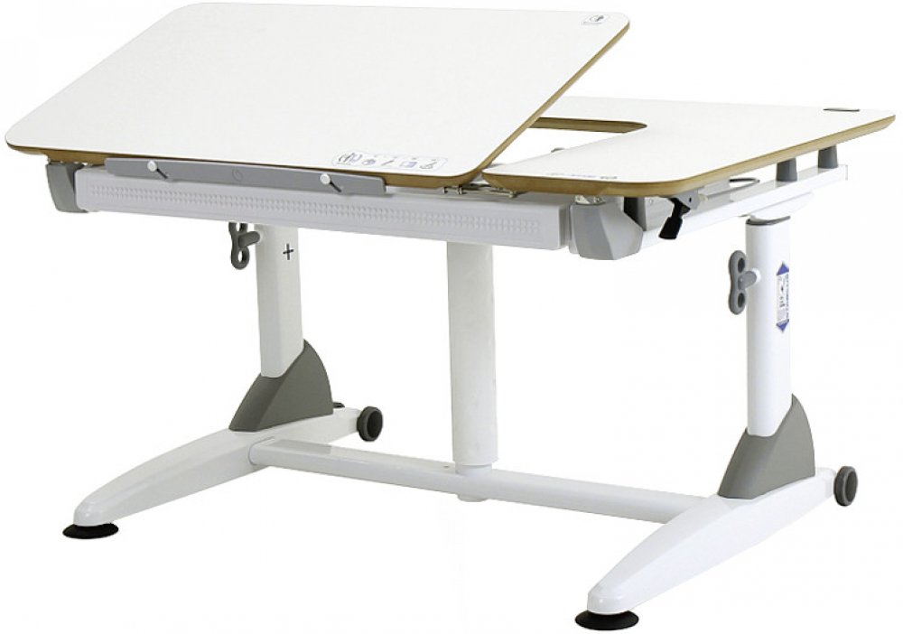 Deska stolu je rozdělena na hlavní pracovní plochu s nastavením sklonu a pevnou odkládací část. Při naklopení pracovní desky zabraňuje padání předmětů vysunovatelná lišta. Pod deskou stolu je praktická zásuvka s organizérem pro uložení psacích potřeb a sešitů. Stůl je dále vybaven 2 kolečky pro snadnou manipulaci.