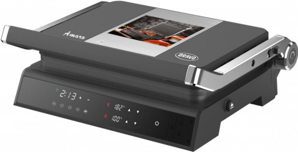Digitální kontaktní grilAmaro B-4939 Bravopro přípravu různých druhů grilovaného masa, ryb, zeleniny, sendvičůotevíratelný na 1805 přednastavených programů : zelenina, ryby, kuře, steak, uzeninygrilovací plocha s nepřilnavým povrchemvyjímatelná spodní a horní grilovací deska pro snadnou údržbujednoduché odtékání tuků a omastkutepelně izolované držadlo pro jednoduchou a bezpečnou obsluhusvětelná indikace provozuautomatický termostatrozměr 295 x 215 mmpříkon 2000 W
