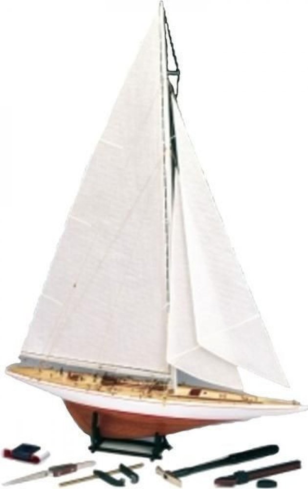 Stavebnice statické makety plachetnice AMATI Rainbow z roku 1934 v měřítku 1:80. Závodní jachta z Amerického poháru s kormidelníkem S. Vanderbiltem. V balení je frézovaný plastový trup, dřevěné paluba, mosazné kování a dřevěné díly, plachta, plány a stojánek atd. Délka modelu 475 mm.