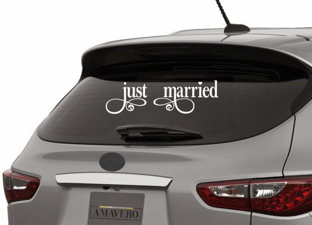 Samolepka na zadní sklo auta je originální dekorací. Nápis just married je vyveden v ozdobném, ornamentálním písmu, které je vhodné zejména pro svatby zámecké. Svůj "svatební kočár" označíte rychle a jednoduše.