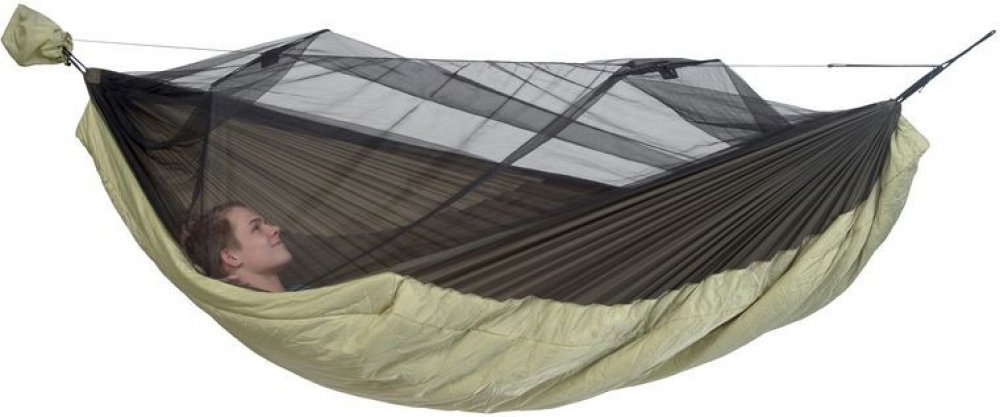 Pevně instalovaný, délkově nastavitelný závěs moskytiéry a optimalizovaný vak na balení umožňují houpací síť obzvláště rychle postavit i sundat. U hamaky nejsou potřeba žádné další podpěrné body. Moskytiéra chrání před létajícím hmyzem, jako jsou komáři a pakomáři, i před lezoucím hmyzem, jako jsou klíšťata, mravenci, komáři a švábi. Houpací síť lze používat na obou stranách, se sítí i bez ní. Vstup je na jedné straně přes dvojitý zip. Pomocí integrovaného lana se síť napíná směrem od těla. Nabízí velký vnitřní prostor díky přiloženým rozpěrným tyčím.