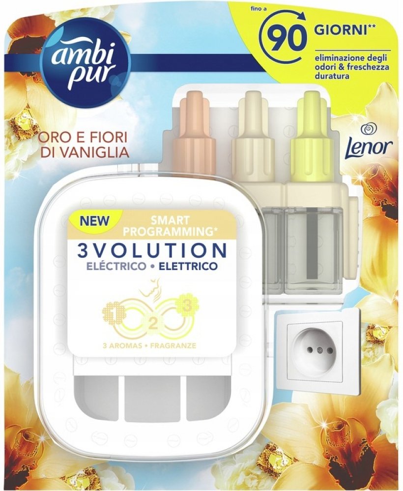Máme pro vás svěží nápad – elektrický osvěžovač vzduchu, který automaticky střídá tři vzájemně se doplňující vůně. AmbiPur znatelně provoní vaši domácnost až na 90 dní. AmbiPur 3volution přináší pohodlný a inovativní způsob, jak trvale odstranit nepříjemný odér, ať už jde o zatuchlinu nebo zápach domácích mazlíčku. Váš dům provoní vlna teplé, jemné vůně. Oleje, jejichž vůně se spolu báječně snoubí...