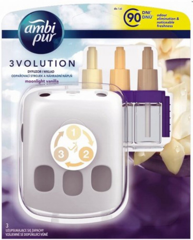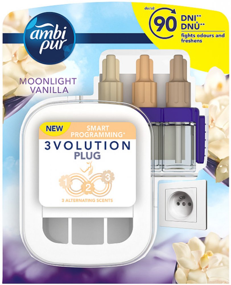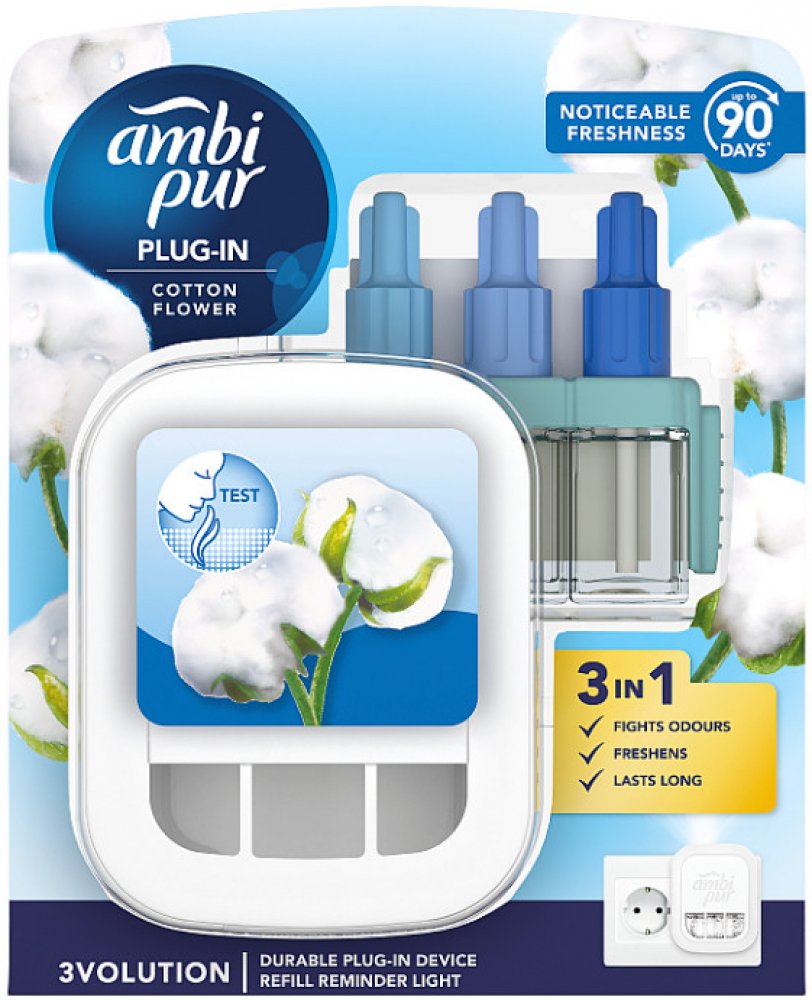 Ambi Pur 3Volution Infinity Cotton průběžně odstraňuje pachy a střídá 3 navzájem se doplňující vůně pro svěžest, kterou budete vždy vnímat. Vydrží až 90 dnů (při používání 12 hodin denně s nastavením nejnižší úrovně odpařování). Objevte krásu Cotton nyní s 2x větším účinkem v porovnání s našimi běžnými osvěžovači vzduchu: Intenzivnější vůně s větším dosahem naplní místnost vůní. Vůně Cotton Fresh je inspirovaná svěžestí čisté bílé bavlny. Vnímejte klid, který vás obklopí, když se vzduch naplní touto čistou a decentní vůní. U běžných elektrických osvěžovačů si na vůně rychle zvykneme a přestaneme je vnímat. Osvěžovač vzduchu Ambi Pur 3Volution svěžest obnovuje tím, že se každých 45 minut automaticky střídají 3°vzájemně se doplňující, vysoce kvalitní vůně. Náplně Ambi Pur 3Volution používejte s odpařovacím strojkem 3 Volution, abyste naplnili váš domov svěžestí a vůní, kterou budete vnímat den co den, týden co týden. 3Volution také umožňuje nastavit intenzitu odpařování vůně a tak vám pomůže vytvořit požadovanou atmosféru.