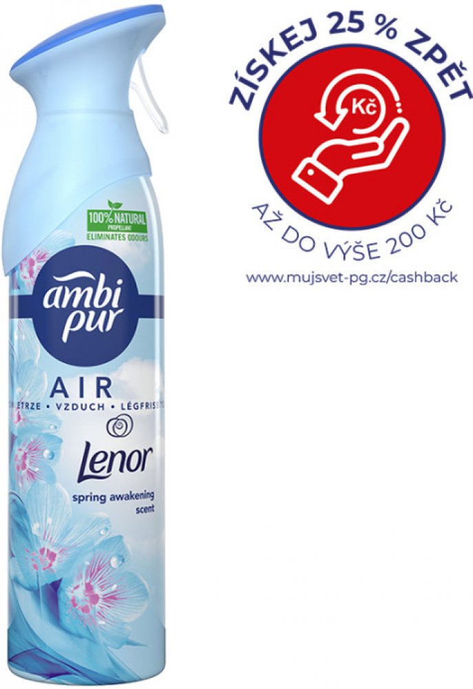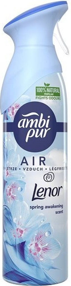 Osvěžovač vzduchu s vylepšenou formulí s technologií OdourClear eliminující pachy. 2x déle trvající svěží vůně až na 60 dní používání. Až o 20 % méně obalového odpadu, bez zbytků aerosolu v obalu. Spring Awakening je svěží, lehká vůně s tóny zeleně, inspirovaná jarní čistotou a charakteristickou svěžestí aviváže Lenor. Obsahuje nehořlavý přírodní hnací plyn. Obsah 185 ml.
