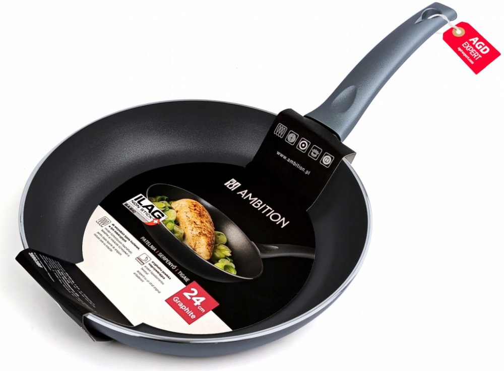 Graphite pánve značky AMBITION jsou vyrobeny s hliníkem, což zajišťuje rychlé a rovnoměrné předehřívání a také výjimečnou trvanlivost a odolnost proti deformacím. Vnitřek pánve je pokryt originální švýcarskou vrstvou Ilag Basic – dvouvrstvou vrstvou s vynikajícími nepřilnavými vlastnostmi a zvýšenou odolností proti poškrábání a otěru. Výrobek je vybaven rukojetí typu Soft Touch, která zaručuje pohodlné používání.
