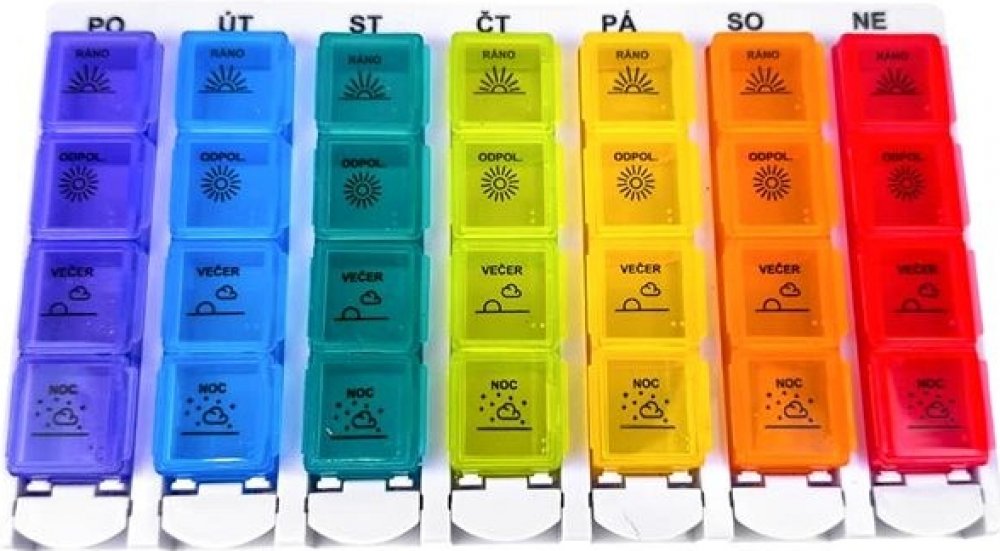 Barevné rozlišení/ estetické provedeníPři zavírání víčka toto cvakne a z vedlejšího oddílu skáčou prášky ven.Ztenčený pantík víček není vhodně řešen. Již po krátkém používání zjišťuji, že některá víčka se zavírají snáze. Jsem plastikář, tuto problematiku znám a předpokládám, že brzy dojde k utržení víčka.