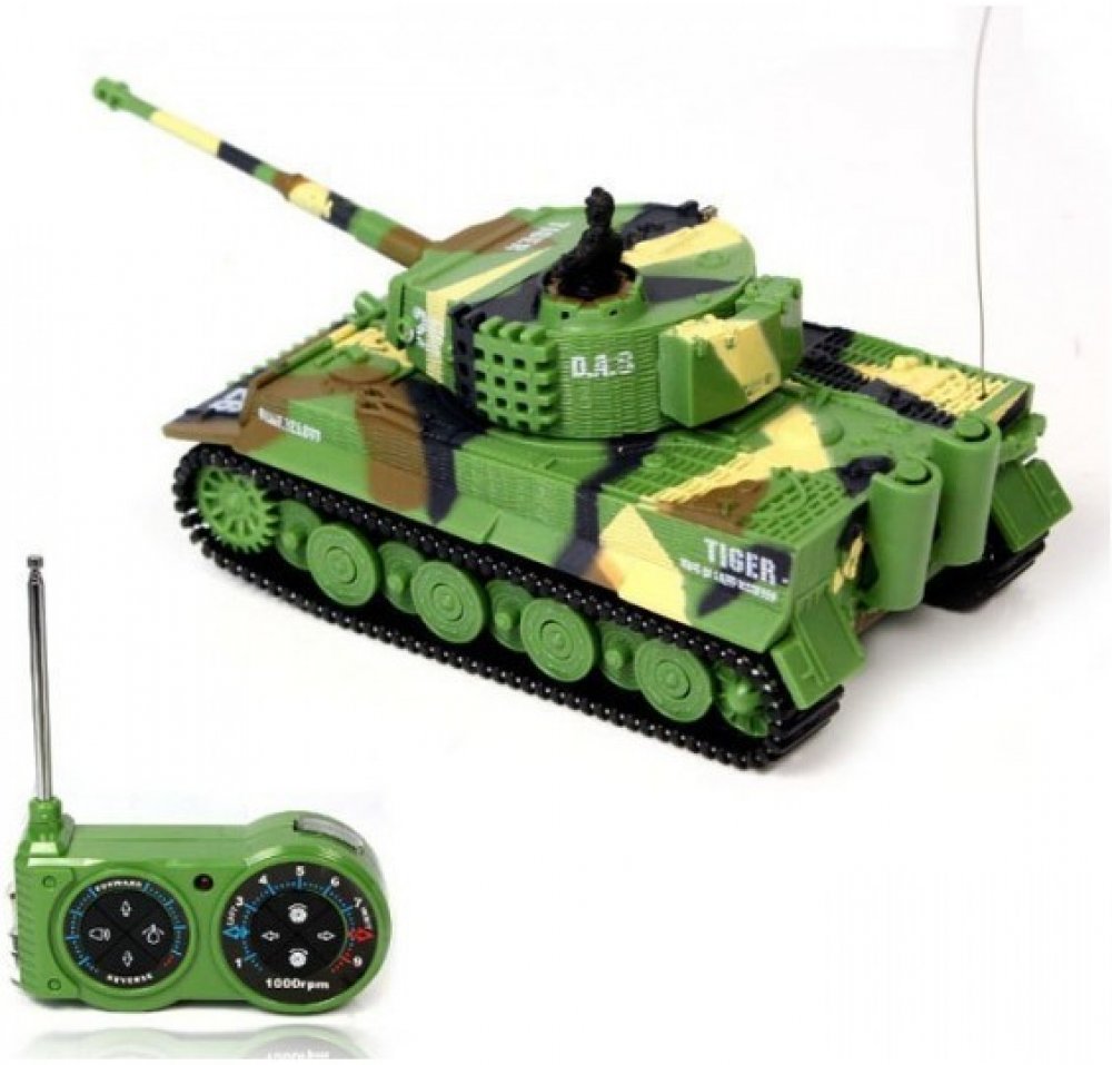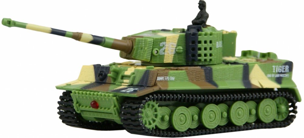 ÚŽASNÝ MINITANK GERMAN TIGER V MAKETOVÉM PROVEDENÍ A S MNOHA FUKCEMI Replika německého tanku German Tiger s otáčením hlavně, zvuk motoru při jízdě, zvukové efekty při střelbě. I přes svou malou velikost ,(délka bez hlavně cca 8,5 cm, výška cca 4 cm) je tento model německého tanku Tiger velmi výkonný a rychlý, jezdí všemi směry. Má pružné a odolné pásy, otočnou věž, zvukové efekty (nastartování, bě...
