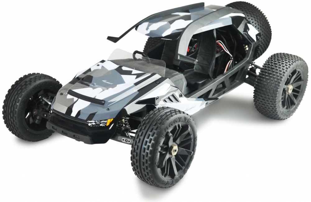 Představujeme terénní model Hammerhead Dune Buggy 1:6 2WD v celé své kráse. Velmi dobře dimenzovaný pohon s 2350 kv střídavým motorem s vysokým točivým momentem a 160 ampérovým regulátorem zaručují čistou zábavu z jízdy ve spojení s působivou akcelerací a vysokou maximální rychlostí. Hammerhead je zásadně lepší než všechny buggy se spalovacím motorem o objemu 28 ccm. Díky továrně instalovanému gyr...