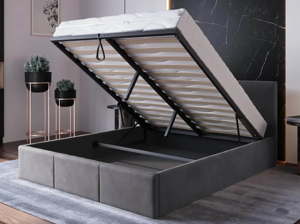 Jedním z klíčových prvků naší postele je vysoce kvalitní velurová potahová látka v grafitové barvě. Tato látka je nejen příjemná na dotek, ale také extrémně odolná a snadno se čistí. Dodává posteli eleganci a luxus. Postel Top Line 7 není jen kus nábytku na spaní. Je vybavena zvedacím rámem, který umožňuje snadný přístup do prostoru pod postelí. Rám se skládá z 2x14 lamel umístěných na pevném kovovém rámu se silnými plynovými zdvihy 80 N, které poskytují výjimečnou oporu matraci a snadné otevírání kontejneru na lůžkoviny. Je to místo, kam můžete uložit lůžkoviny, přikrývky nebo jiné předměty, které chcete mít z dohledu.