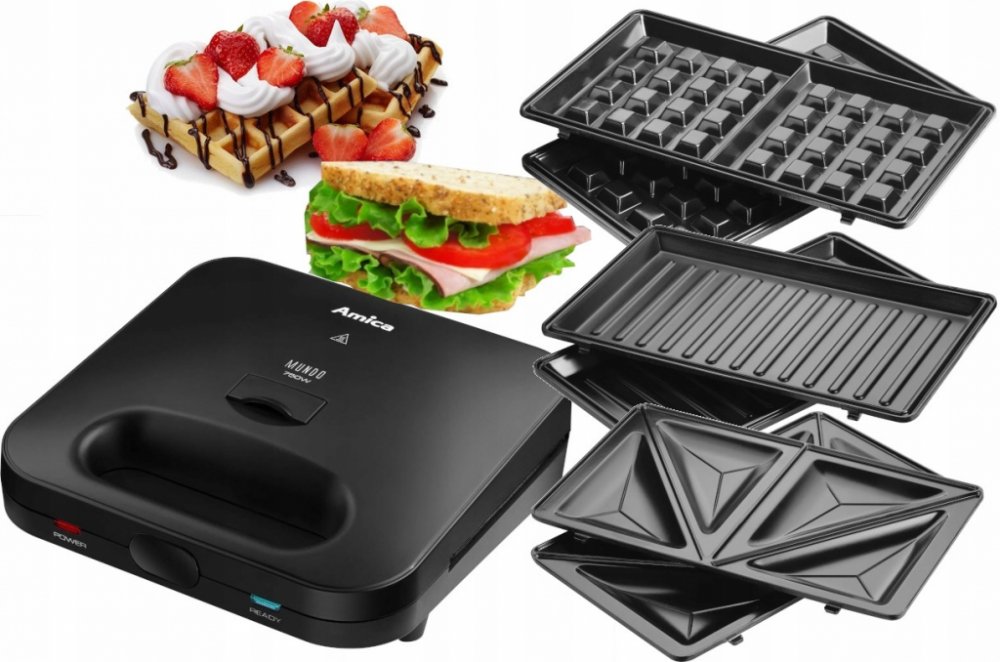 Amica SMK 4011 – Sendvičovač Amica s vyměnitelnými plotnami na trojúhelníkové tousty, panini či vafle. . Sendvičovač Amica SMK 4011 – kategorie „Sendvičovače“