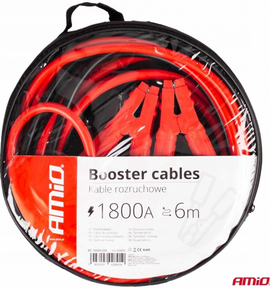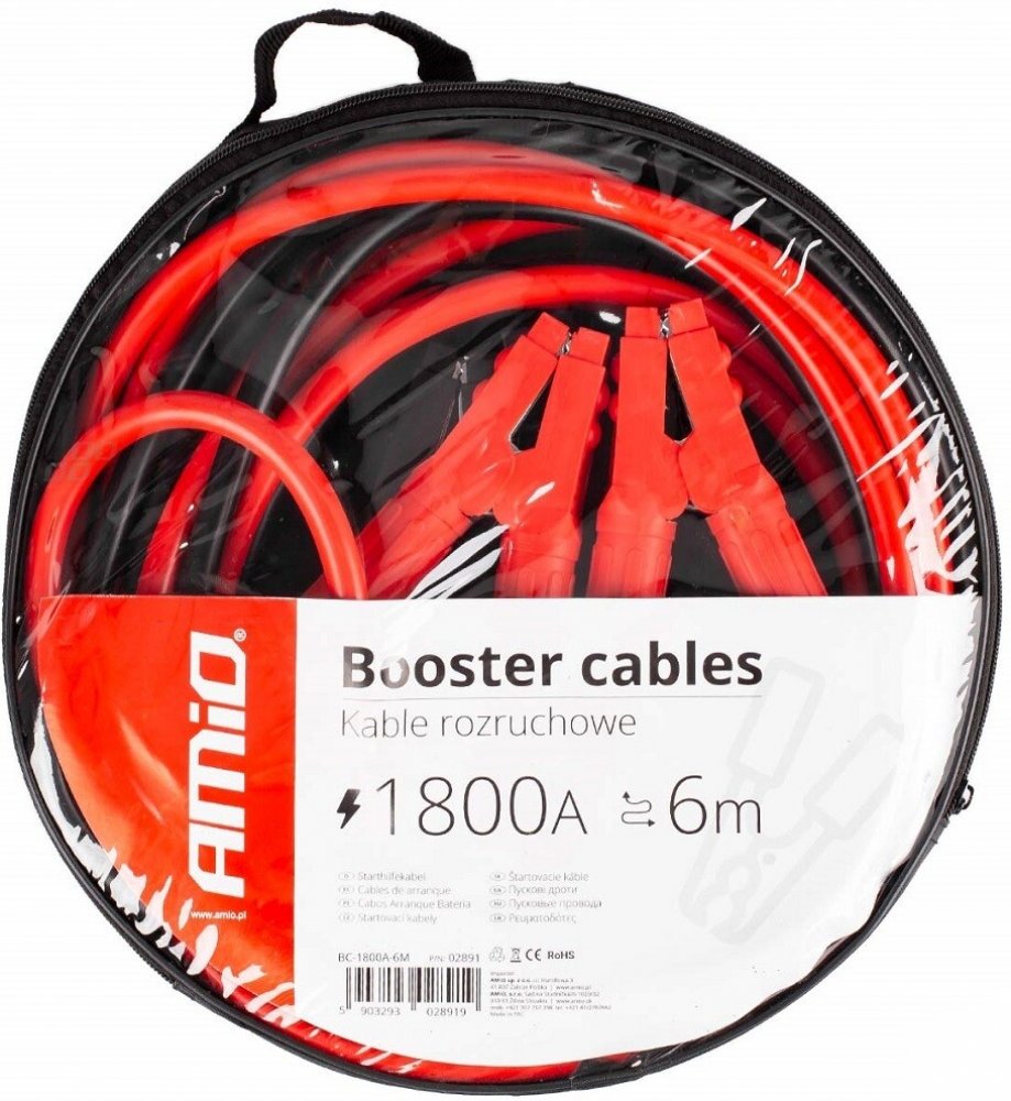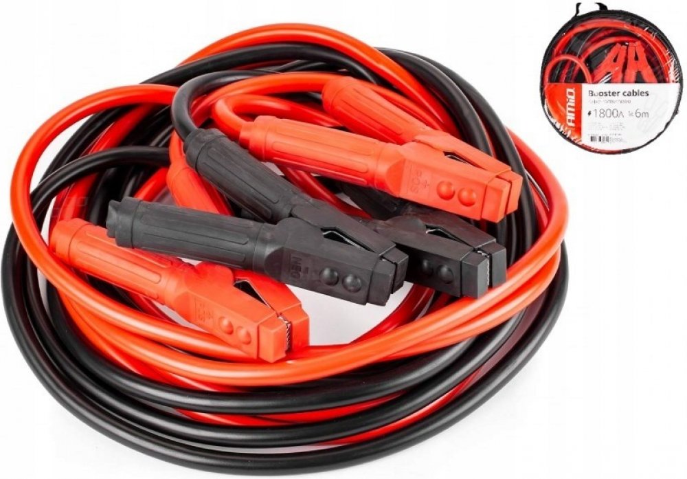 Sada silných a pevných startovacích kabelů o délce 2 x 6 metrů je schopna krátkodobě přenést špičkový startovací proud až 1800 A.