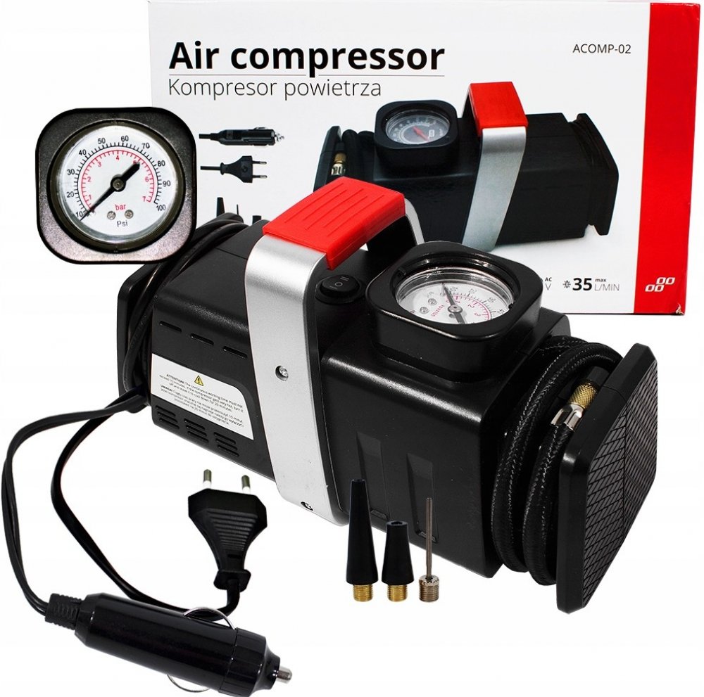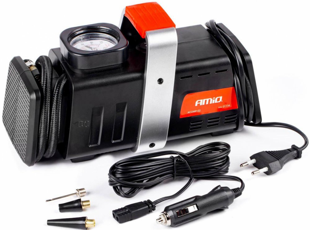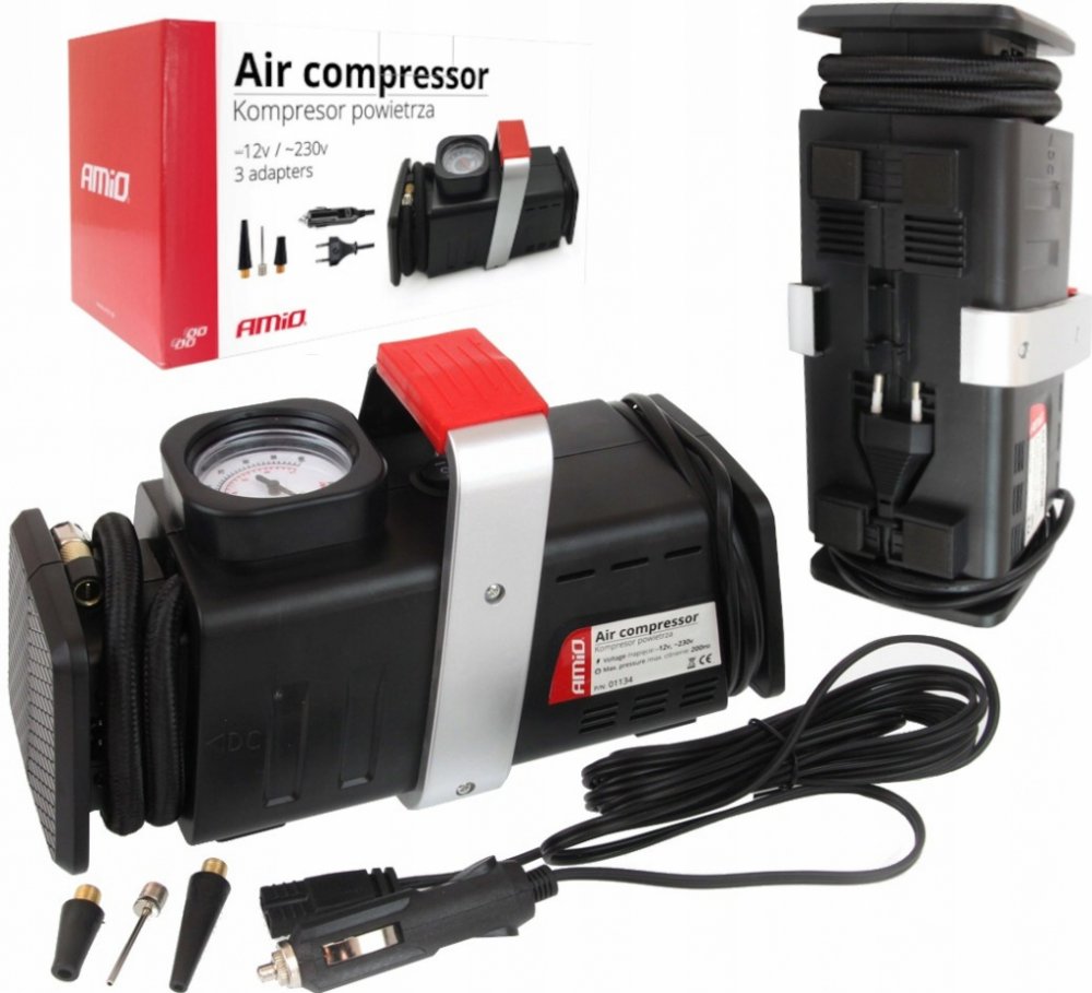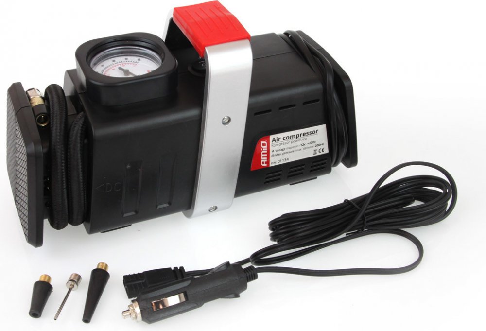 Kompresor má napájecí kabel 230 V AC s délkou 1,8 m, další dlouhý napájecí kabel 12 V DC 3 V a jeden dlouhý 55 cm, zakončený závitovým koncem pro čerpání kol aut a motocyklů a protiskluzovou patkou.