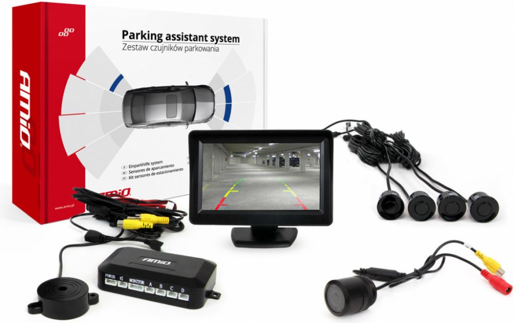 AMiO Sada asistentů parkování 4 senzory černé TFT01 4,3 `s kamerou night vision CAM-301 IR 28mm