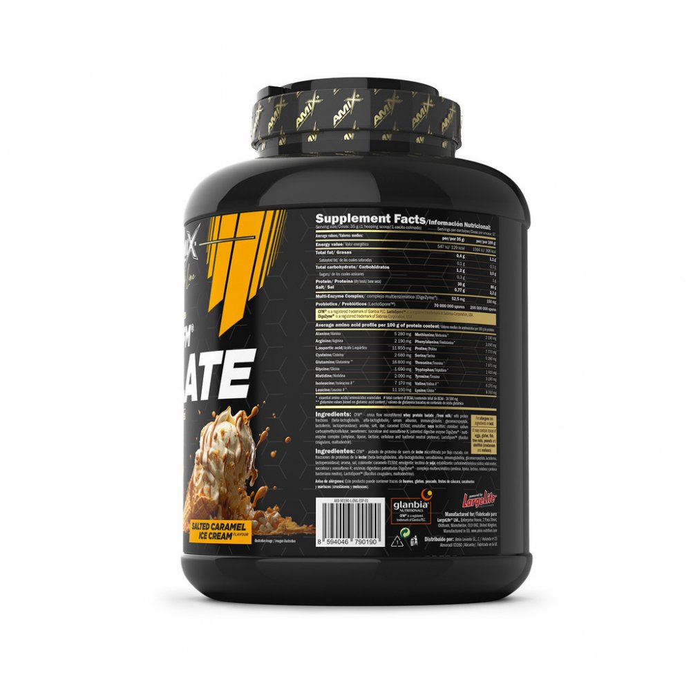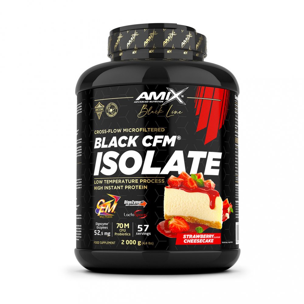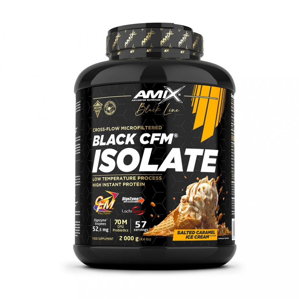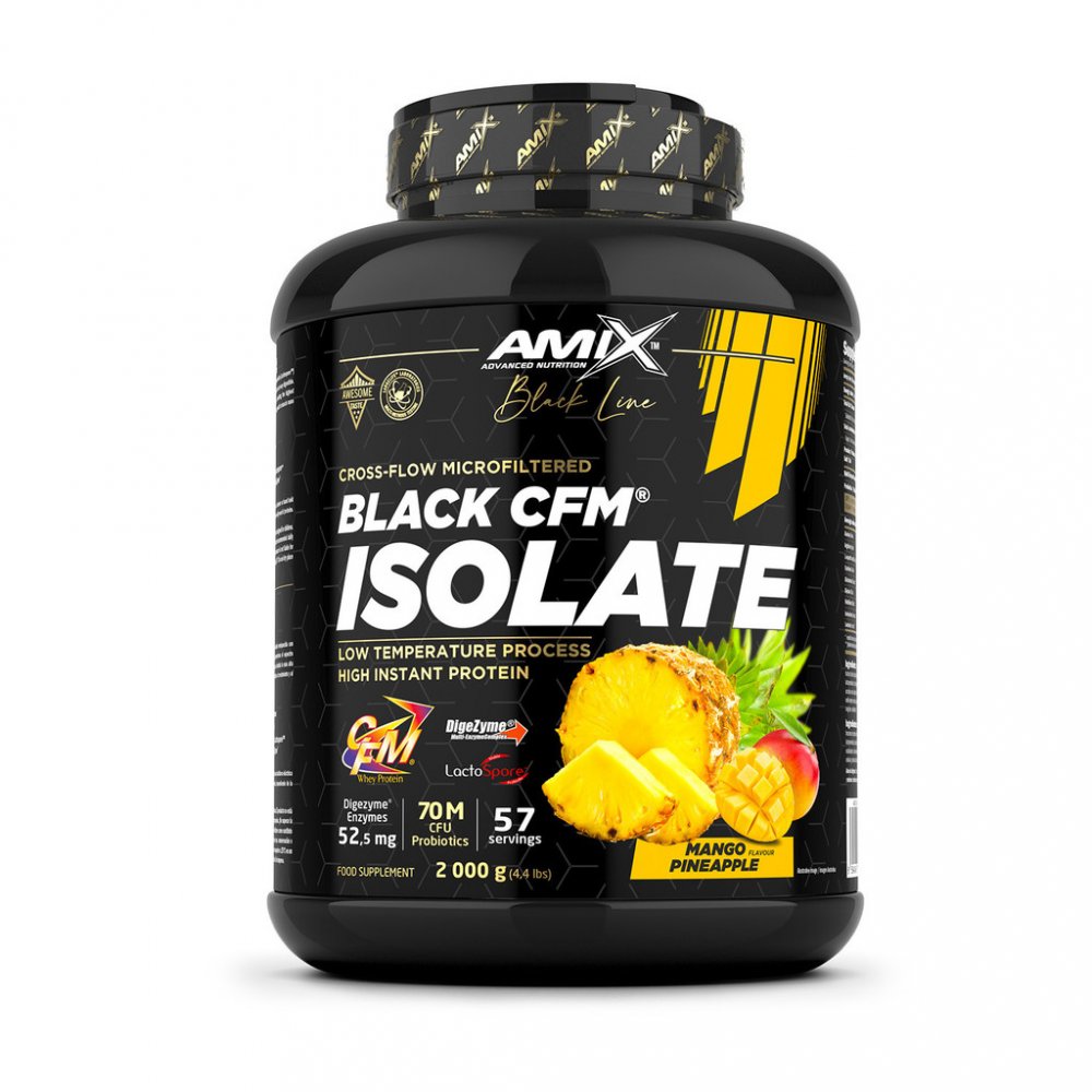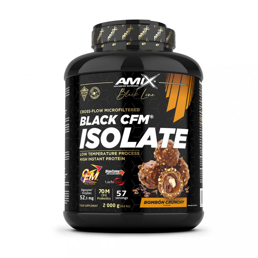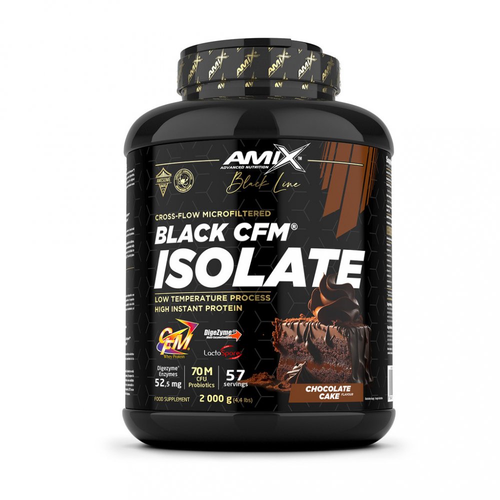 Amix™ Black CFM® Isolate je syrovátkový bílkovinný izolát, prémiové kvality, obohacený o probiotika (Lactospore™) a enzymový komplex Digezyme®. Díky tomu je Black CFM® Isolate opravdu rychlý a lehce stravitelný. Poskytuje celé spektrum aminokyselin přirozeně se vyskytujících v syrovátkovém proteinu, včetně nejvyšší koncentrace BCAA a dalších esenciálních aminokyselin. Protein přispívá k růstu svalové hmoty k udržení svalové hmoty.Benefity:
