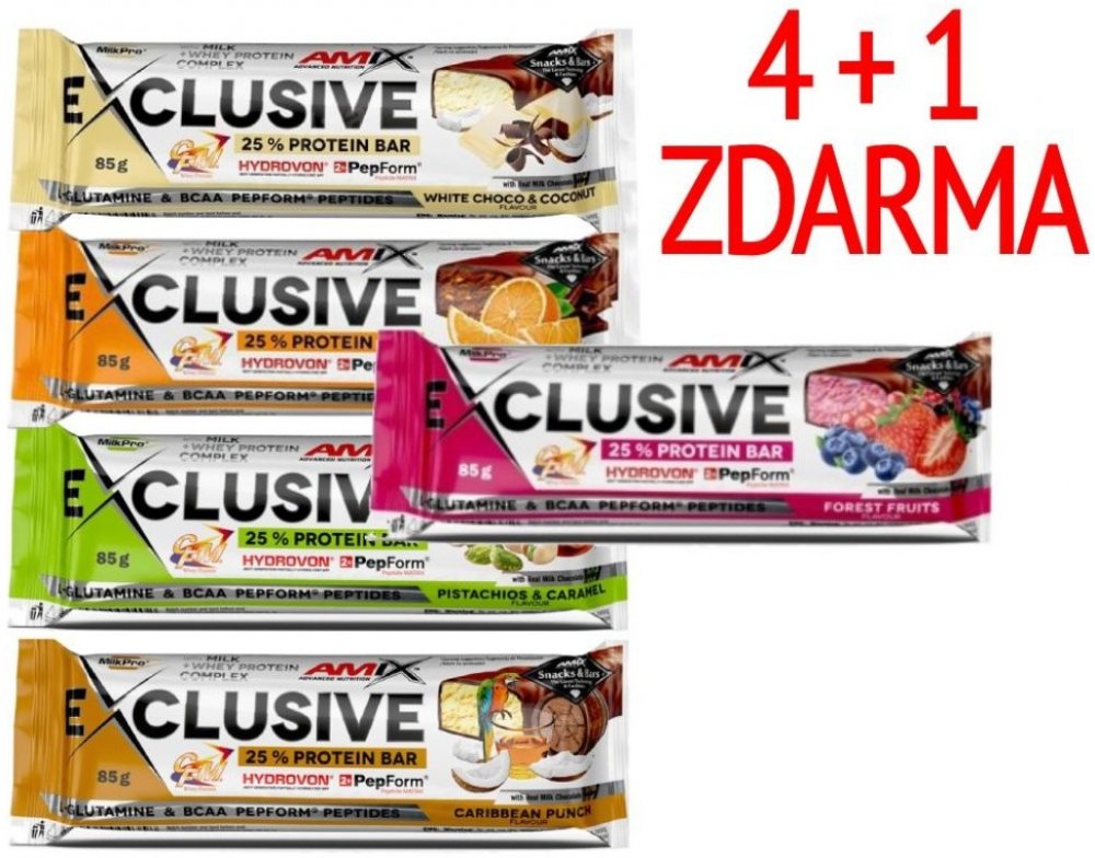 AMIX EXCLUSIVE PROTEIN BAR Bude dodáno vždy 1 ks z příchutí: Čokoláda/Banán, Lesní směs, Arašídovo máslová sušenka, Pistácie/Karamel, Bílá čokoláda/Kokos Upozornění: Na produkt již nelze aplikovat další slevu (slevový kód, věrnostní sleva).