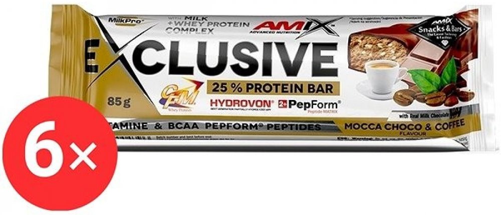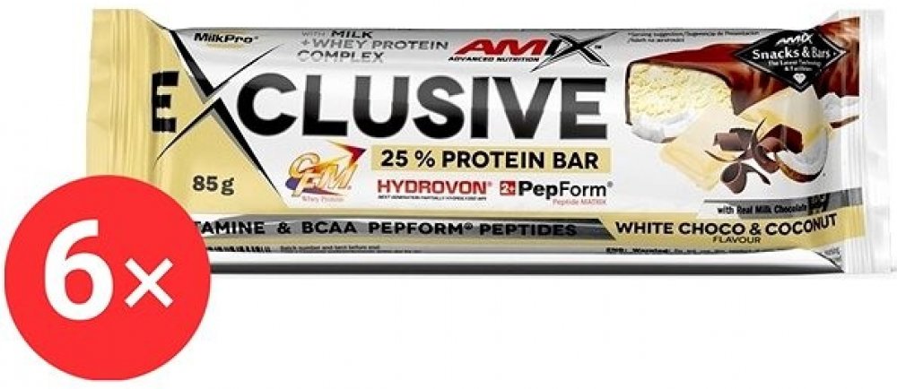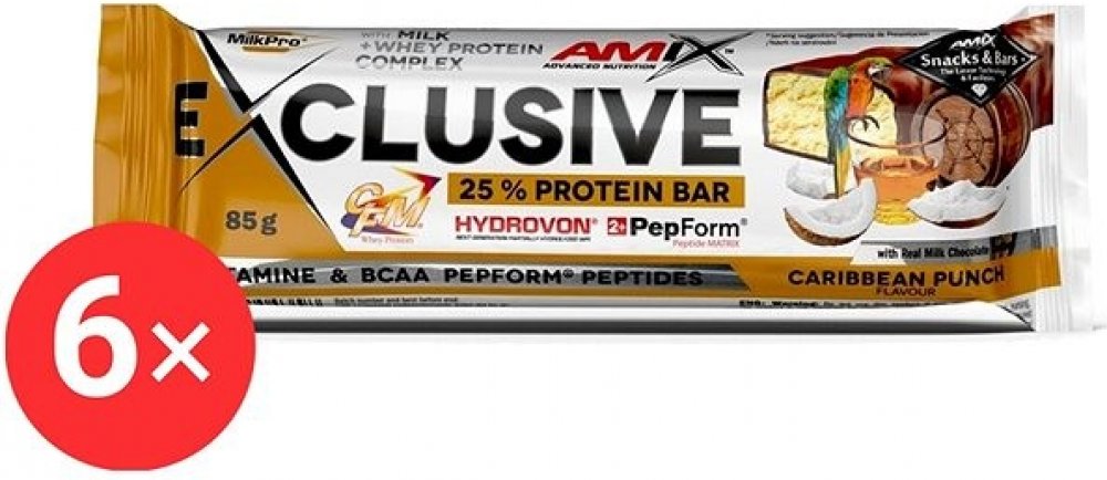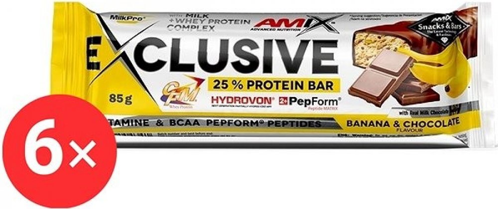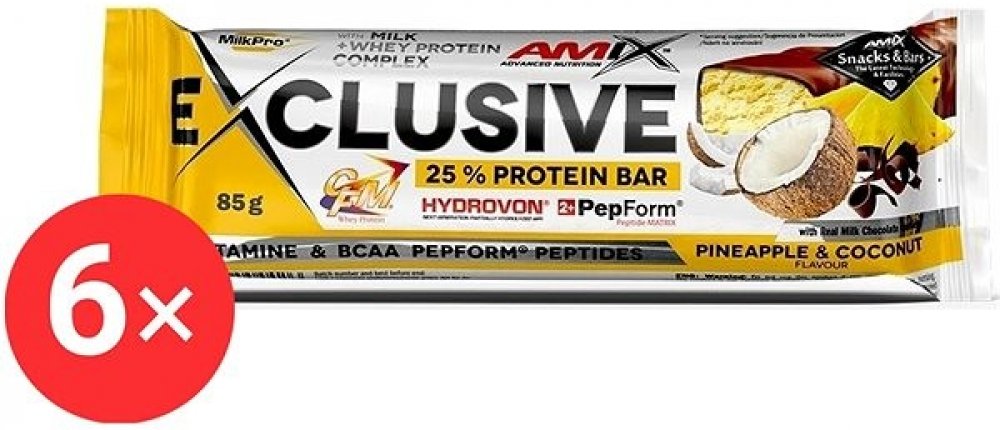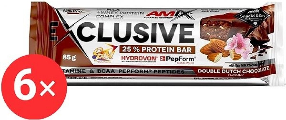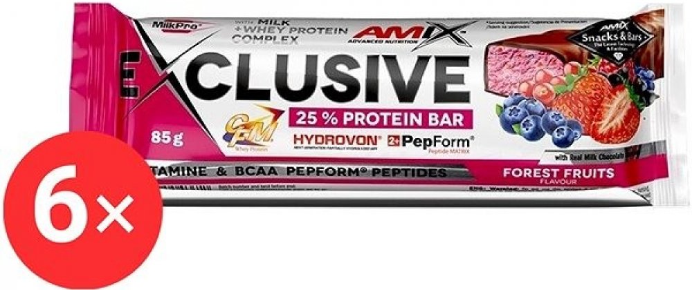 Amix Nutrition Exclusive Protein BarForest Fruits, 6× 85 g Proteinová tyčinka Amix Nutrition Exclusive Protein Bar nadchne sportovce i aktivní jedince. Obsahuje směs MilkPro Protein Blend tvořenou mléčným bílkovinným izolátem, CFM syrovátkovým bílkovinným izolátem a koncentrátem a částečně hydrolyzovaným syrovátkovým bílkovinným izolátem. Ve 100 g se tak ukrývá 26,3 g bílkovin. Součástí tyčinky Am...